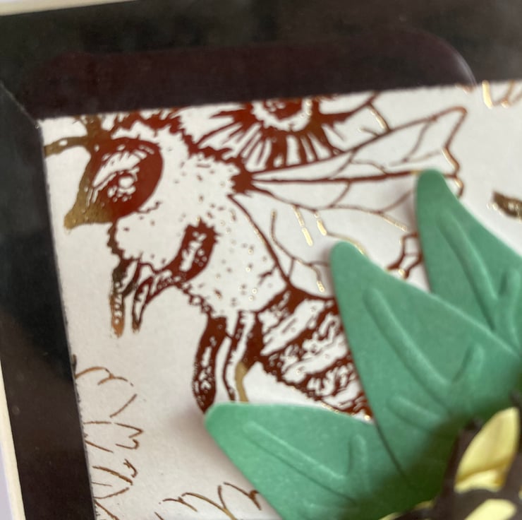 Each petal, leaf and the bee have been individually cut and embossed. The background is white and embossed with a gold bee detail.