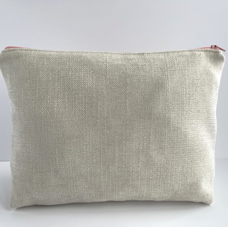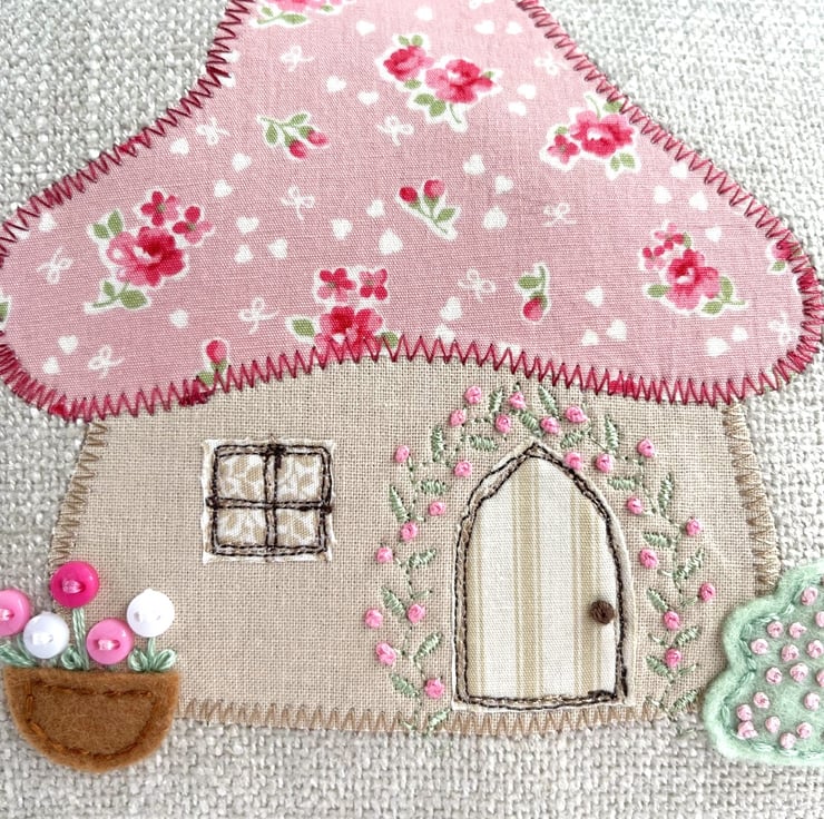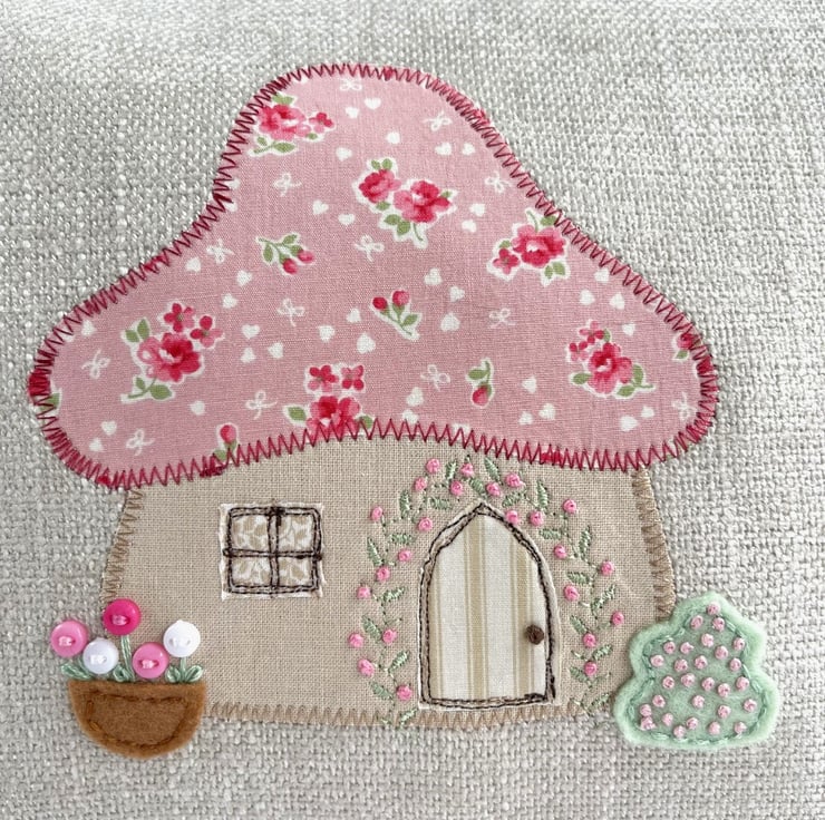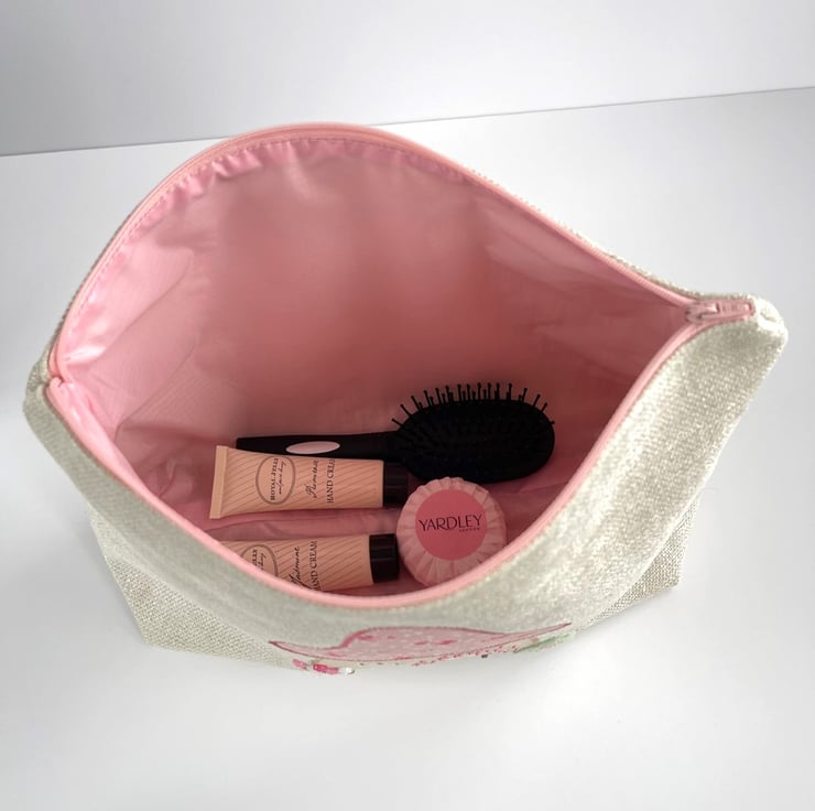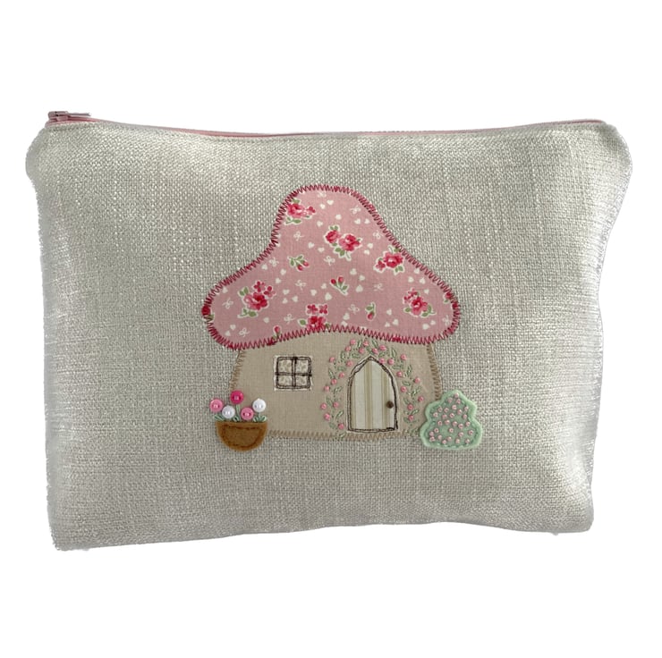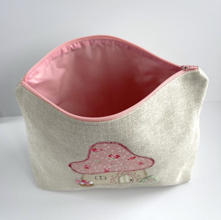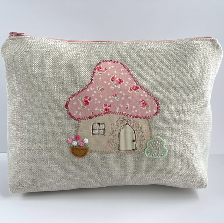 Mushroom house toiletry bag. This lovely wash bag is made from cream upholstery fabric with an appliqué mushroom house. The mushroom top is made from pretty pale pink fabric with a floral pattern in deep pink, white and green. The stem of the mushroom house is beige and has an arch-shaped door with cream and beige stripes and a hand-embroidered door handle. The little quartered window is made from cream fabric with a tiny beige leafy pattern. Around the door, I’ve stitched a green machine-embroidered leaf pattern, to which I’ve then added pink hand-embroidered French knot flowers. On one side of the house is a bush made from pale green felt with pink French knot flowers. On the other side is a golden-brown felt bowl containing tiny pink and white button flowers, and hand-embroidered stems and leaves. The bag fastens with a matching pale pink zip and is lined with pale pink water-resistant fabric. The base of the bag is boxed to give extra space inside for all those essential items.