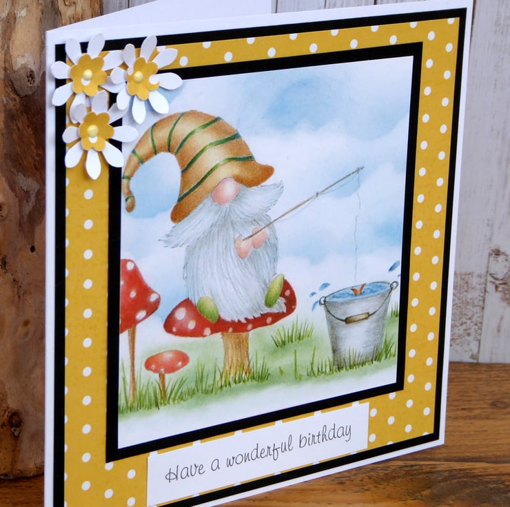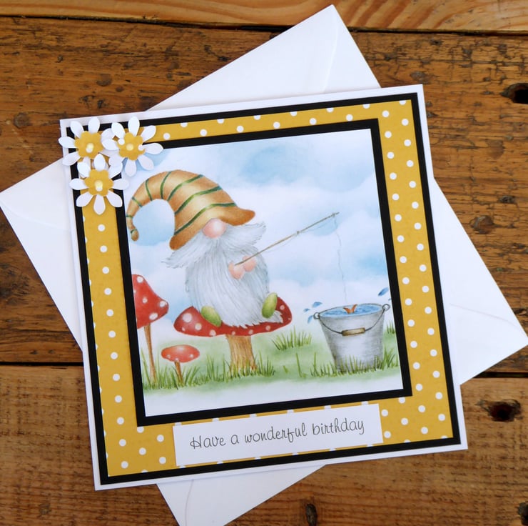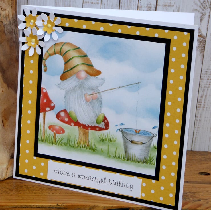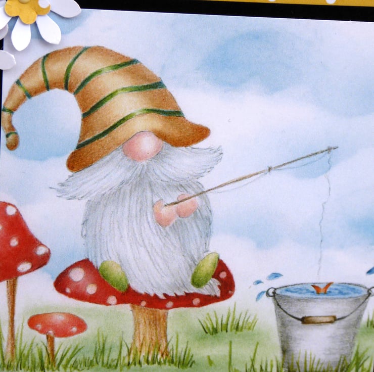 A lovely birthday card made from 300gsm white card. Used black card, patterned paper and an image of a cute gnome, layered up made some small flowers and added a sentiment to complete.