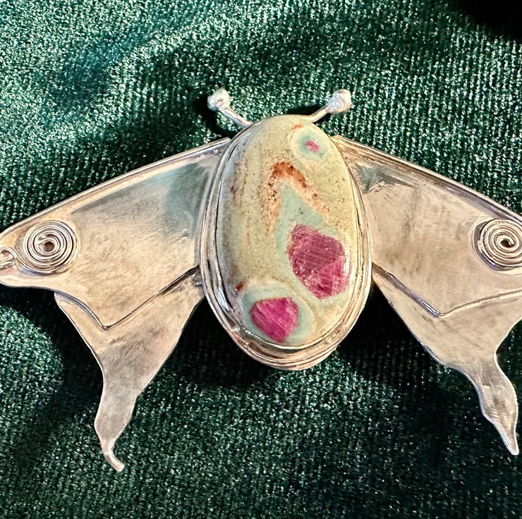 Beautiful ruby in fuchsite set in a silver Luna moth broach. This broach is a real statement piece which sits perfectly on the chest, will look fabulous pinning up a scarf.