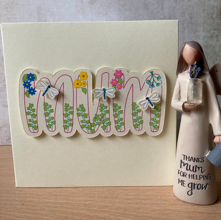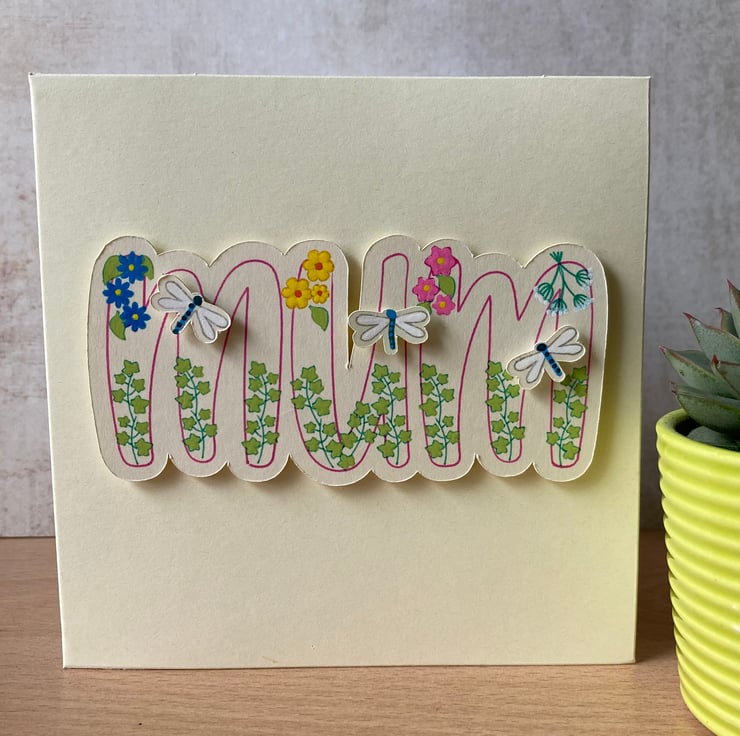 The perfect card for all occasions, an original design, hand made and hand painted, it features the word 'Mum' outlined in pink, ivy leaves are climbing from the base of each letter, whilst at the top there are small clusters of blue, yellow, pink and white flowers. At randome points across the card are three hand painted dragonflies. The outlines of some of the flowers and the dragonfly wings are done in metallic ink, giving the card a shine and lustre when it catches the light.