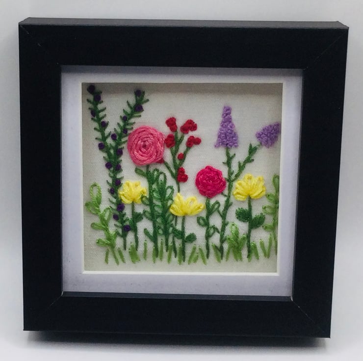 This piece is hand embroidered onto cream Aida. Made to look like a wildflower border and has my interpretations of flowers, roses , lupine ? Daisies ? And other random flights of my imagination. Colours are lilac, purple, pink shades , red and yellow with green foliage