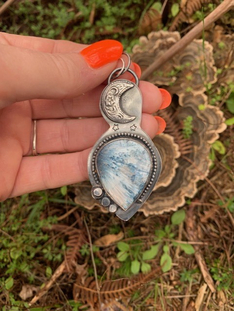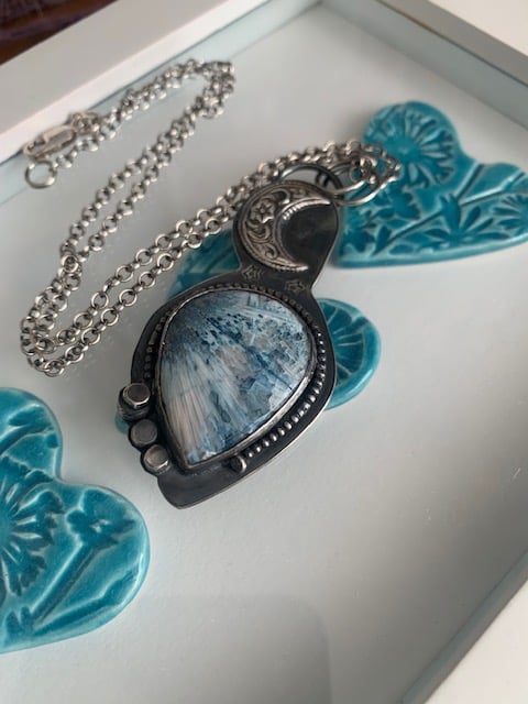 Beautifful moon and star design Blue Scolecite with gorgous markings to the stone another one of my favourite designs and looking for its forever home. I do love the moon designs.