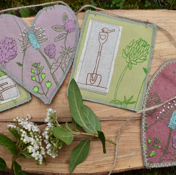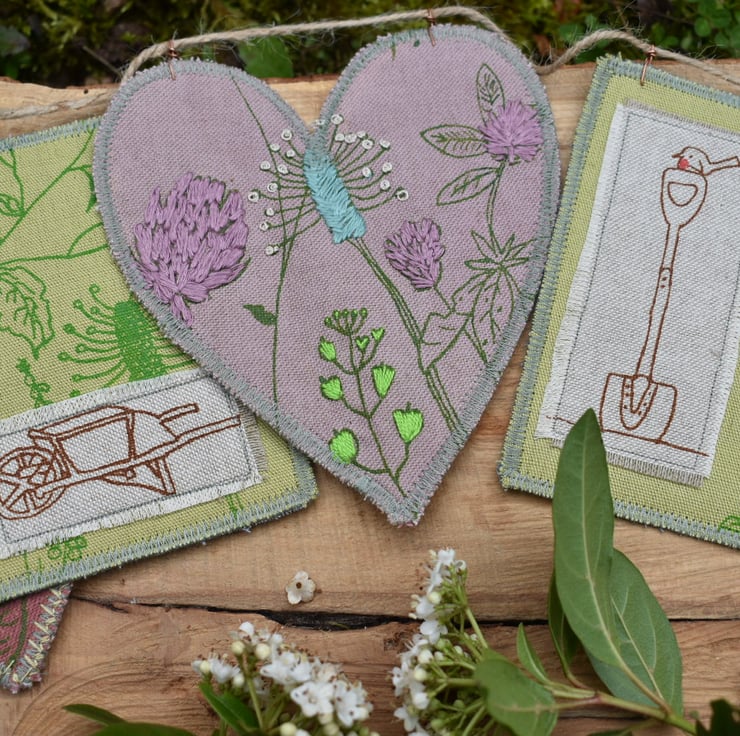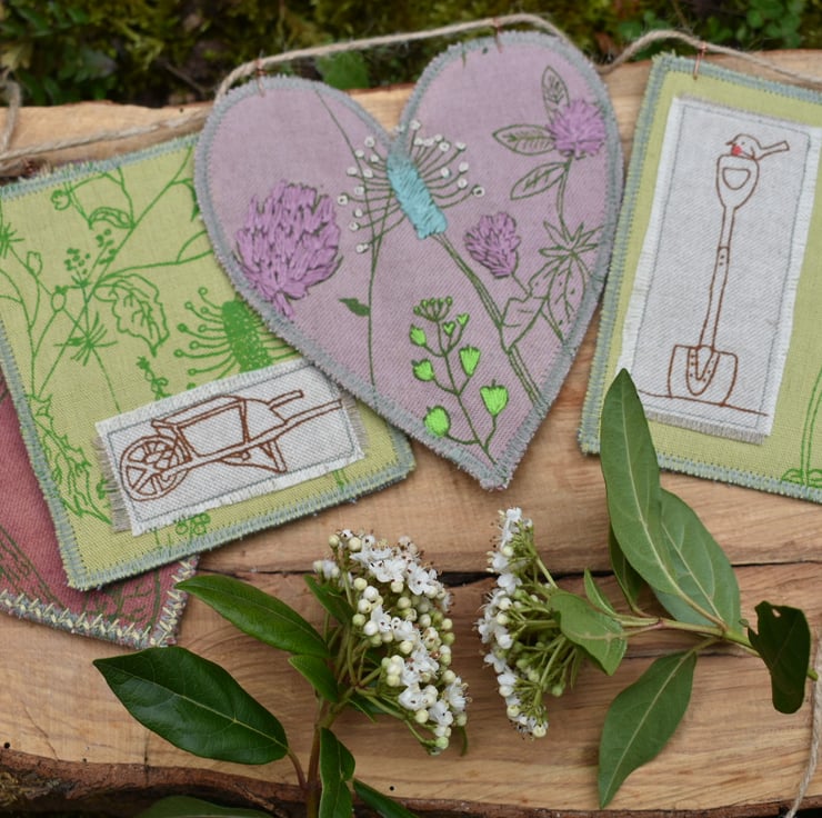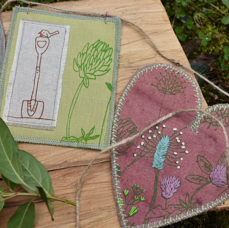 There are 5 panels that have my screen print designs. There are 2 green linen rectangles measuring 10cm by 13cm. They have green screen prints to with appliquéd wheelbarrow and Robin on spade. There are 3 hearts naturally dyed with elderberry and sloe. These measure approximately 13cm by 15cm at longest and widest points. They have wild flower screen prints with hand embroidery for a pop of colour and texture.