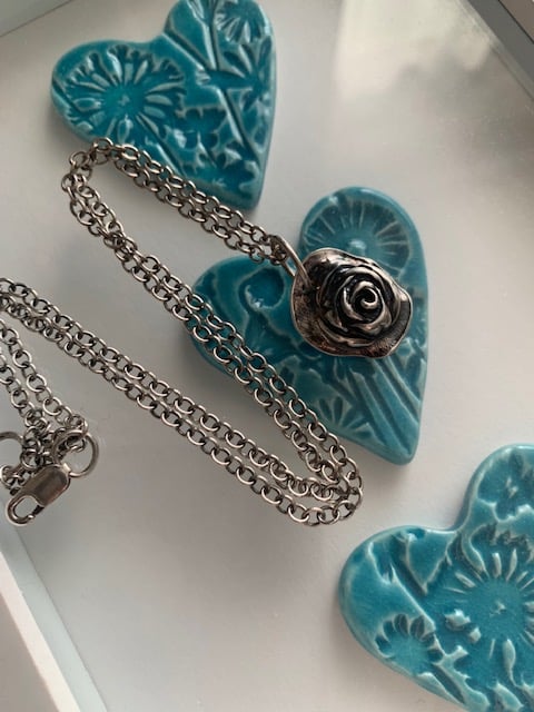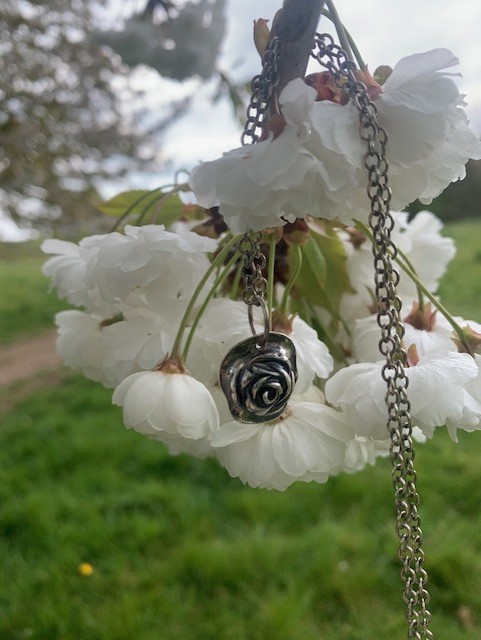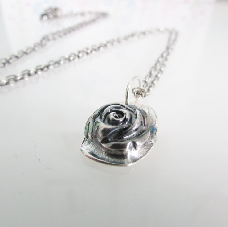 A beautful handmade Fine Silver Rose pendant, very simple and elegant would suit any outfit, for everyday wear the rose has been oxidoixed (blackened) to make the detail stand out and give the look of being antique.