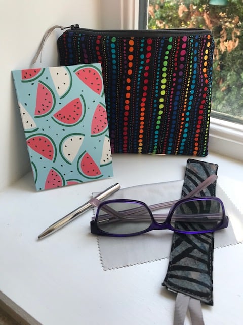 As a book lover, apart from my glasses, there are other items I like to keep handy: notepad and pen to make notes (often for my bookclub), cloth to clean my specs, and a lovely handmade bookmark to seal the deal. I have put them all in this handy pouch that I always keep next to whatever I'm reading. I wouldn't be without mine.