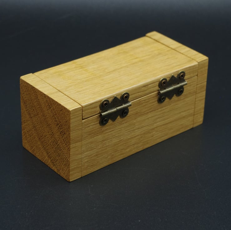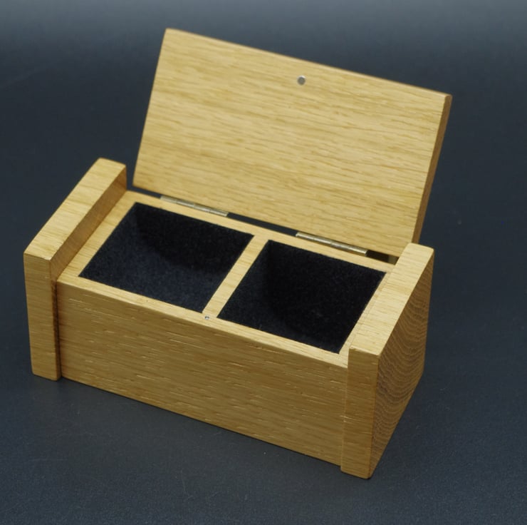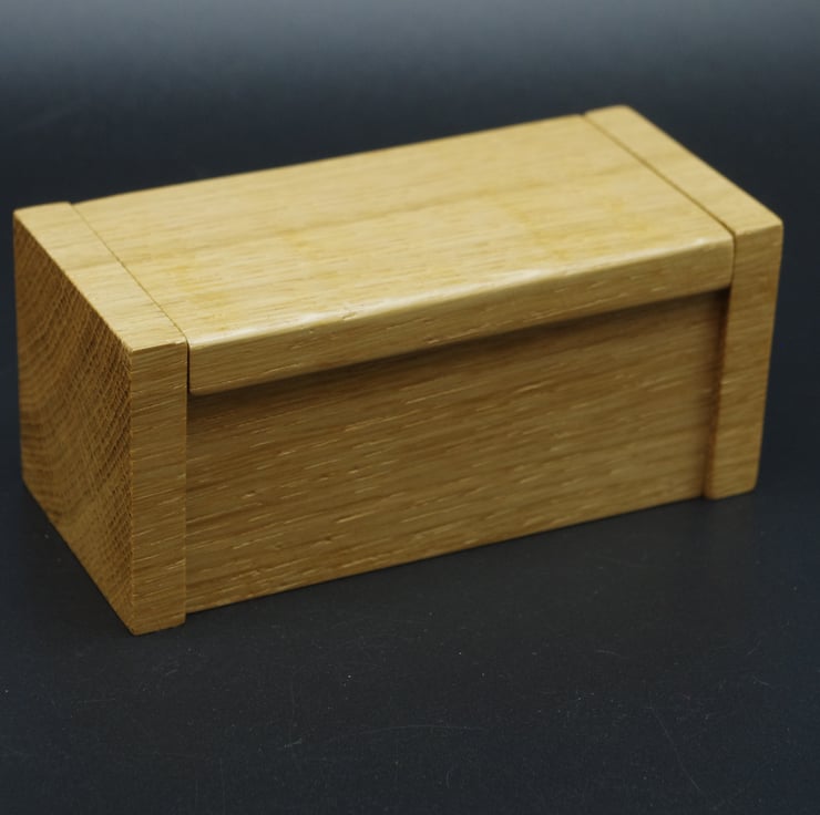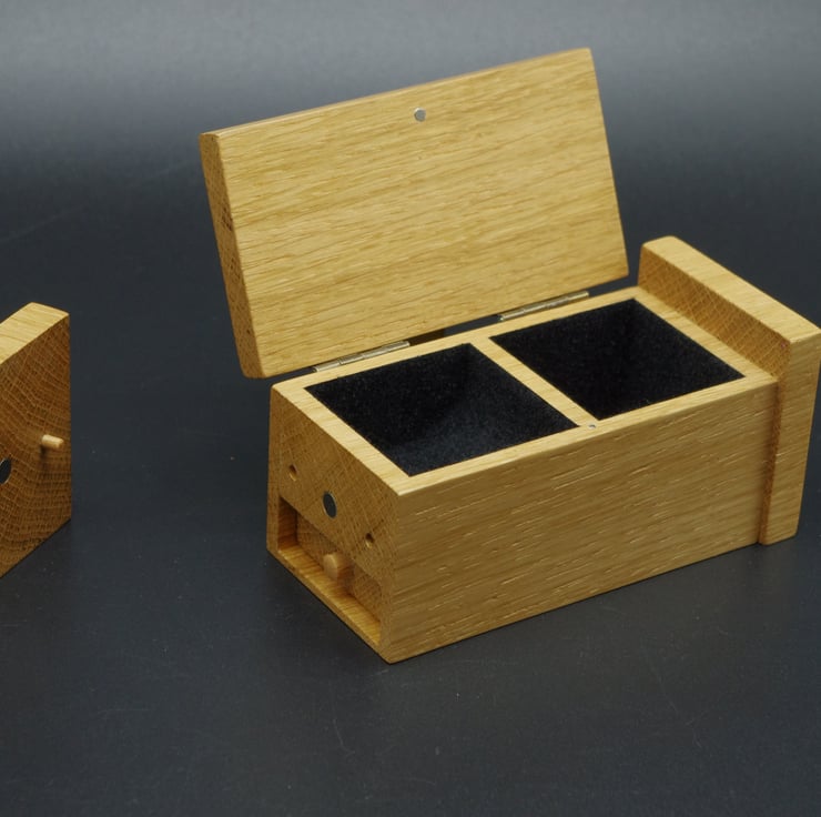 The box has a hinged lid and two apertures. The end piece can be removed to reveal the secret drawer.