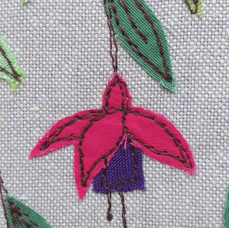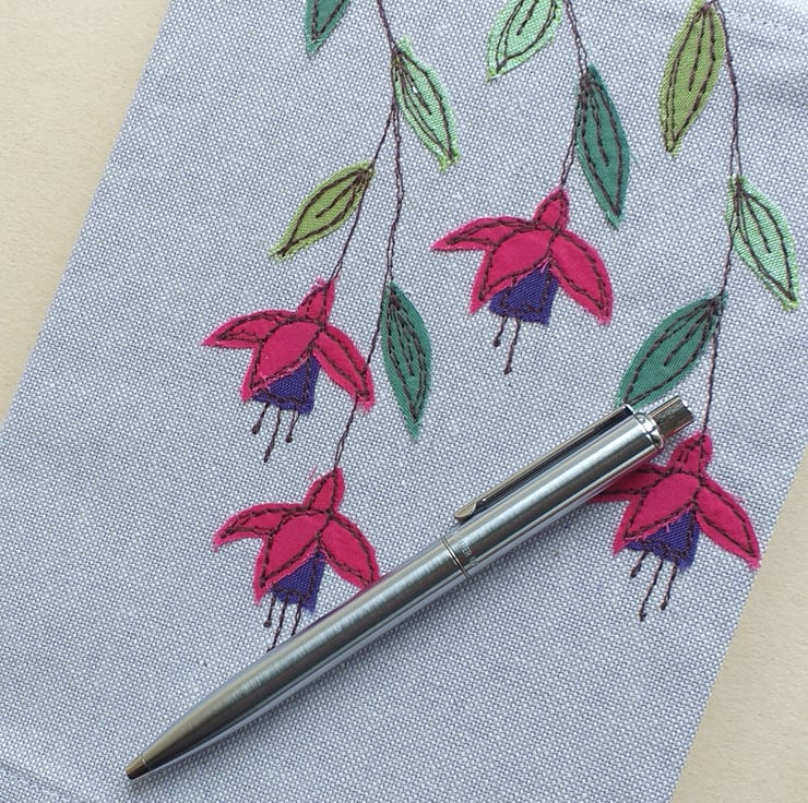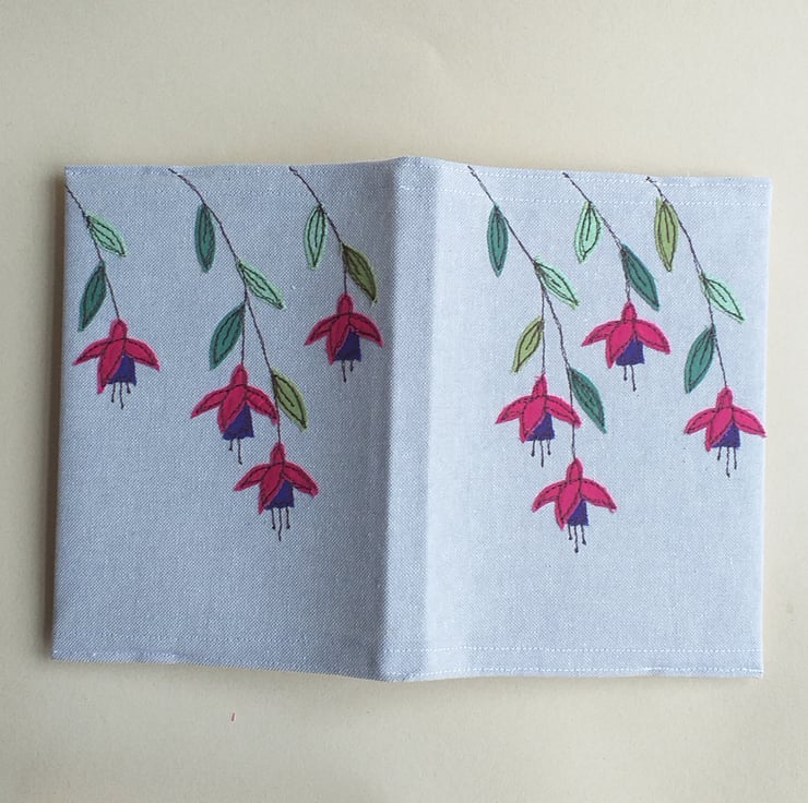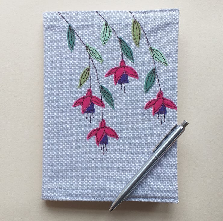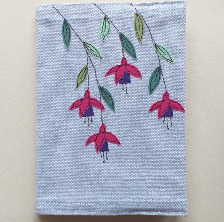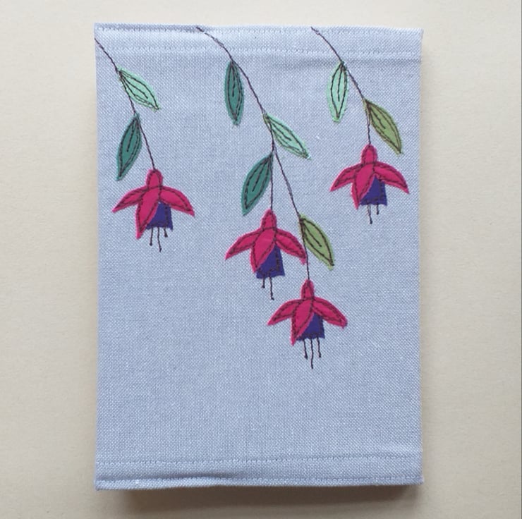 A pretty notebook cover made from lilac linen and embroidered with a design of fuchsias on the front and back. The fuchsias are made by appliqueing small scraps of fabric on to the linen using free motion embroidery.