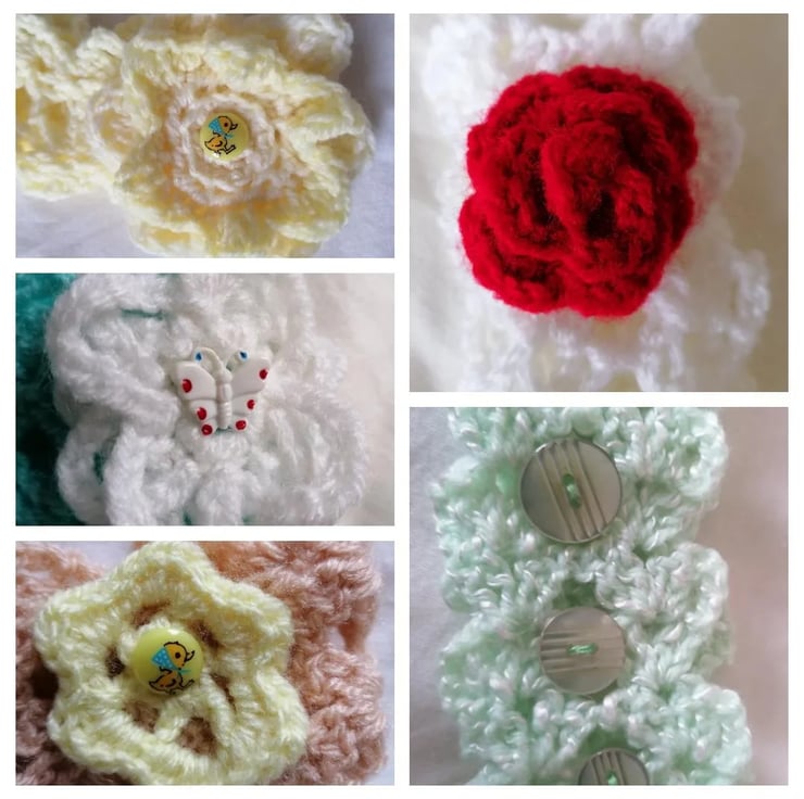 Crochet Alice bands with flower and button details for babies made by April Star Knits with 100% acrylic yarn making them a BRONZE item.