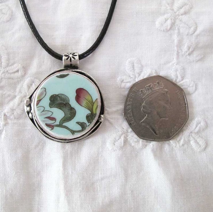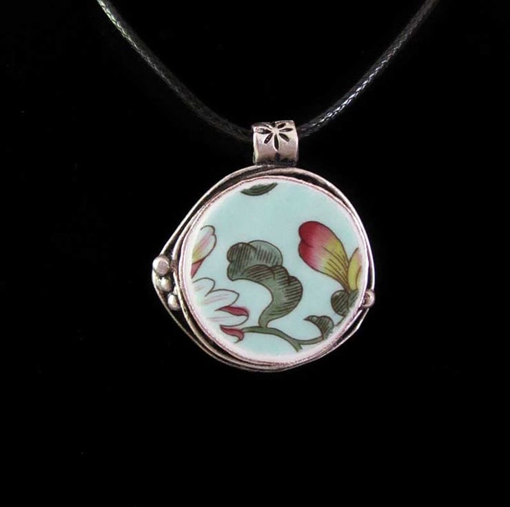The pendant has been crafted from broken, chipped or crazed china that is no longer fit for purpose - no 'perfect' plates were harmed in the making of my jewellery! This piece is from a beautiful Ironstone Calyx ware plate called Ming Jade. Each pendant is a unique statement piece and has its own little characteristics from the vintage china it's been taken from. It makes a very unusual and stylish gift.