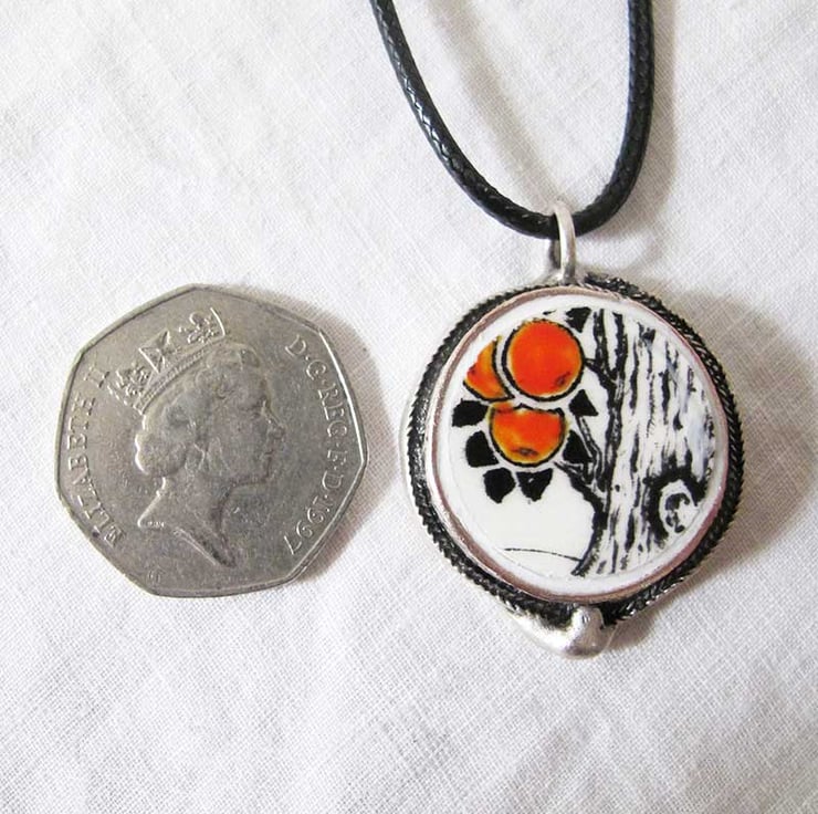 The pendant has been crafted from broken, chipped or crazed china that is no longer fit for purpose - no 'perfect' plates were harmed in the making of my jewellery! This piece is from a beautiful Art Deco plate by Crown Ducal called 'The Orange Tree'. Each pendant is a unique statement piece and has its own little characteristics from the vintage china it's been taken from. It makes a very unusual and stylish gift.