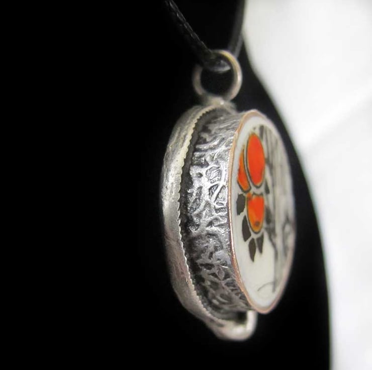 A beautiful hand crafted pendant made from a vintage china plate, in an antiqued silver metal mount. The pendant measures approximately 3.5cm tall including the bail, 3cm wide and 0.8cm deep. The setting is in an asymmetrical design.
