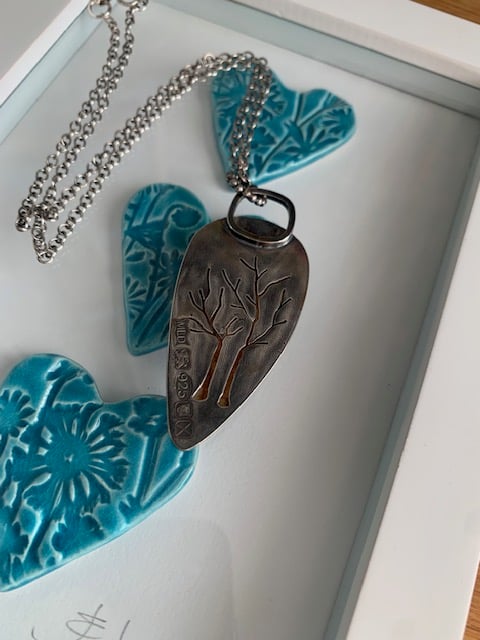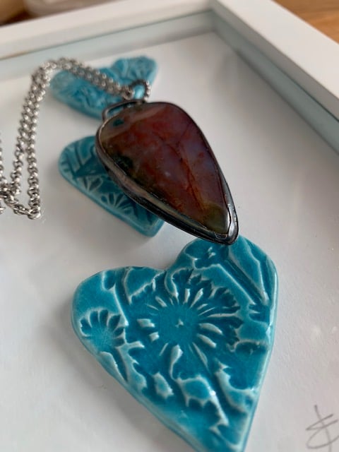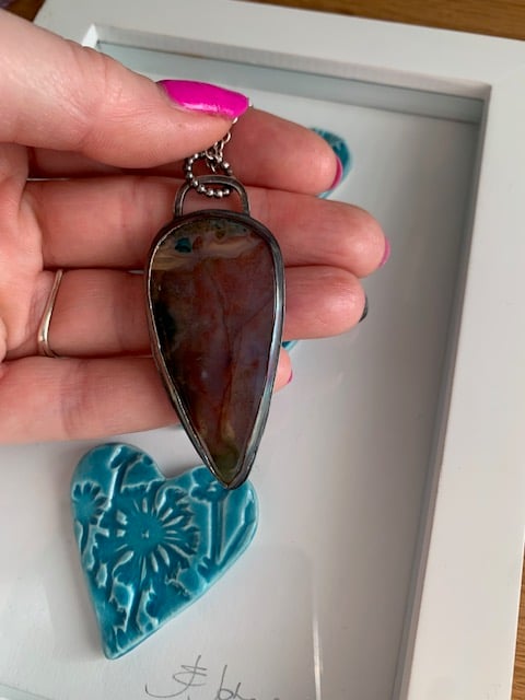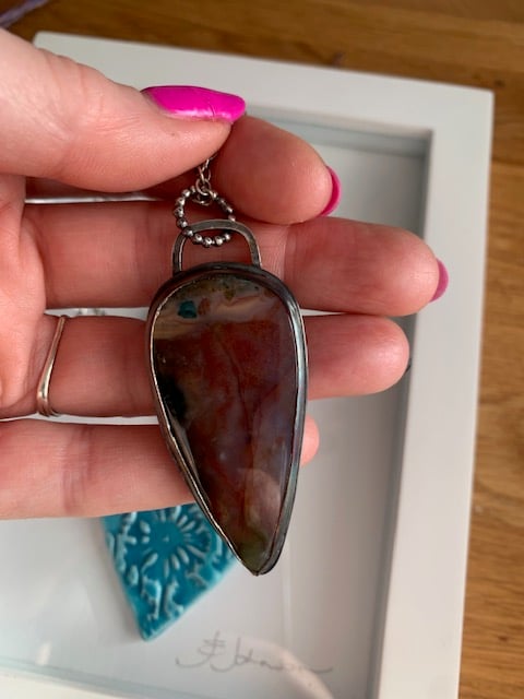 Gorgeous Red moss agate which has a tree cut out of the back of the pendant to let sunlight through,some beautiful veins in the moss, I just love the stone, with red and greens coming through. The pendant is blackened (oxidised) to give the effect of antique look and for the detail to stand out more.