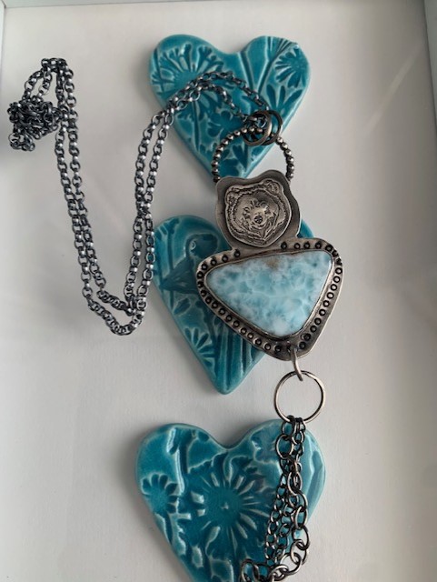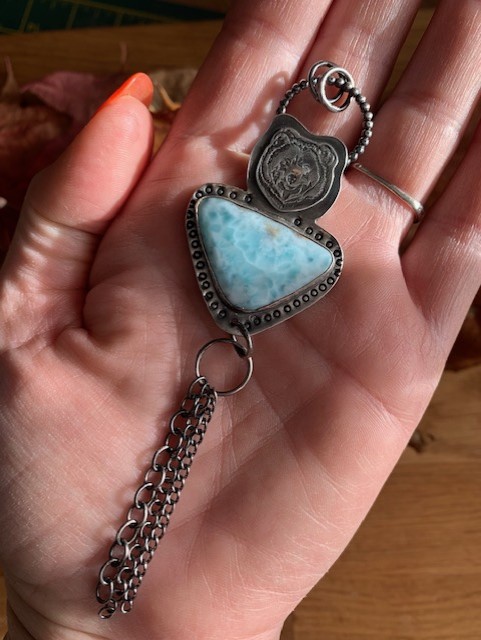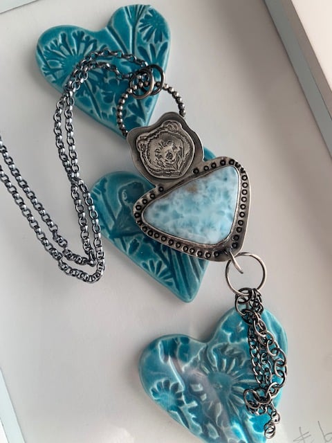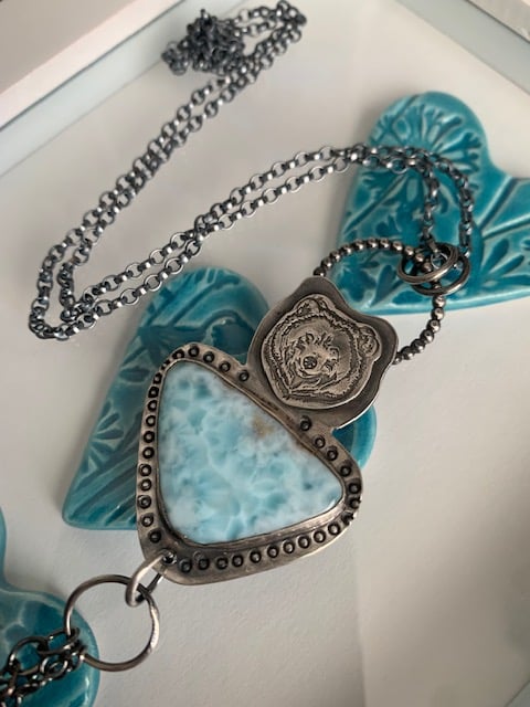 The pendant is blackened (oxidised) to give the effect of antique look and the detail stand out more. Larimar radiates love and peace and promotes tranquility said to enlighten and heal in physical, emotional,mental and in a spiritual way.