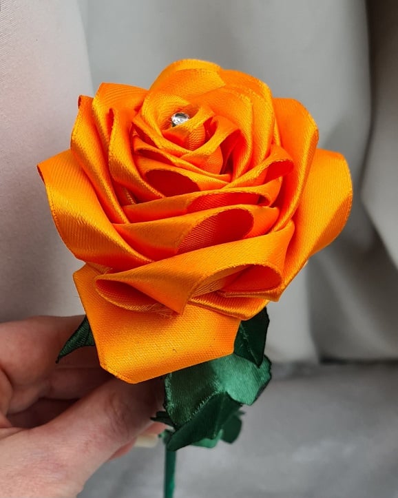 A beautiful handmade single stem rose (one flower only), made with a gorgeous Orange Satin (Polyester) ribbon. This ribbon is so lovely, and is so fantastic to use to create beautiful things with. The stem is made from bamboo (Non-bendy) and Wrapped with a Dark Green tissue paper, the leaves are made from a Dark Green Satin ribbon also.