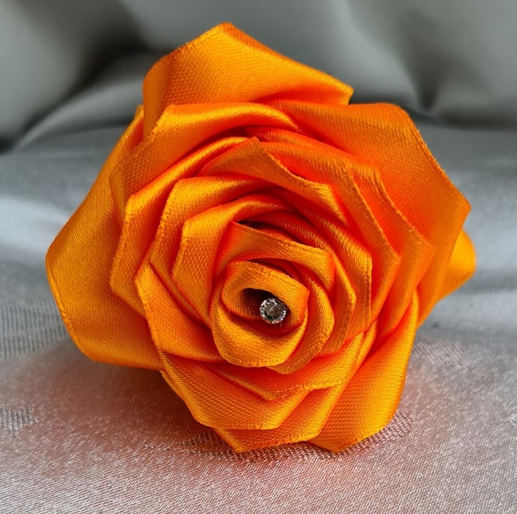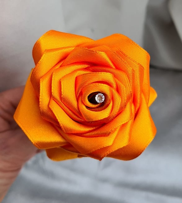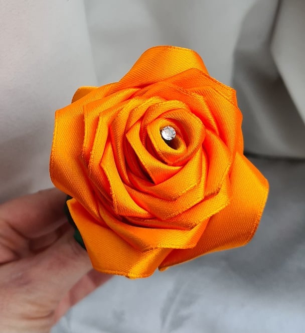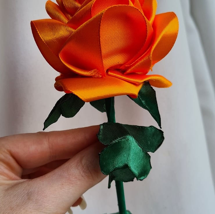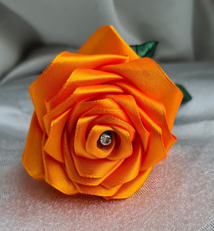 A beautiful handmade single stem rose (one flower only), made with a gorgeous Orange Satin (Polyester) ribbon. This ribbon is so lovely, and is so fantastic to use to create beautiful things with. The stem is made from bamboo (Non-bendy) and Wrapped with a Dark Green tissue paper, the leaves are made from a Dark Green Satin ribbon also.