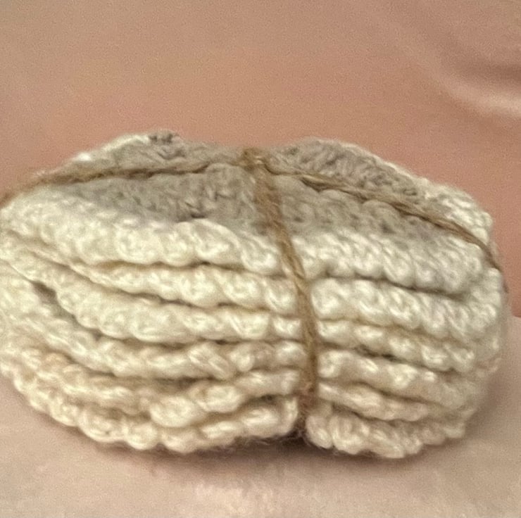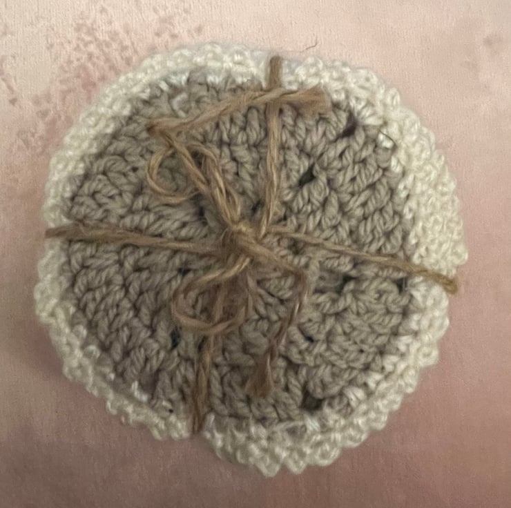 Hand made coasters, in cream and beige. Approximately 9.5cm diameter