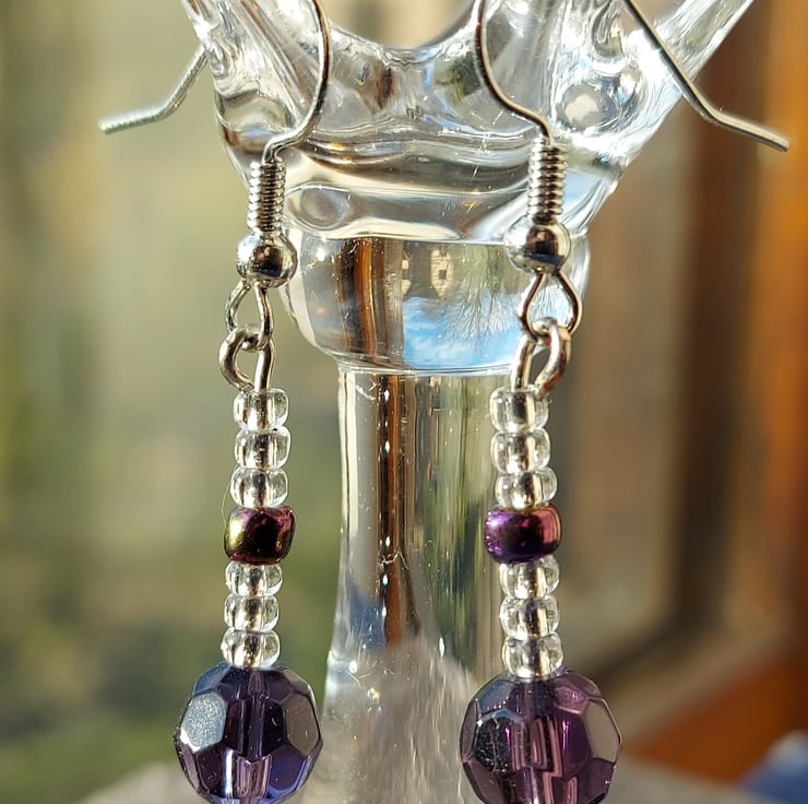 These sparkly dangle earrings have as their focal point an 8mm faceted round crystal bead in purple, complemented by six 3mm clear seed beads lined with silver and a 4mm purple bead. The earrings are light and comfortable to wear and the beads swing freely on their wire settings. The drop below the hook is 2.5cm. The ear and the bead wires are all made from silver-coloured jeweller's wire.