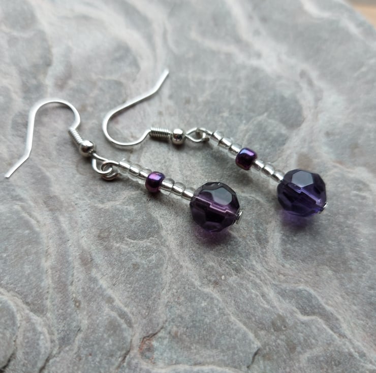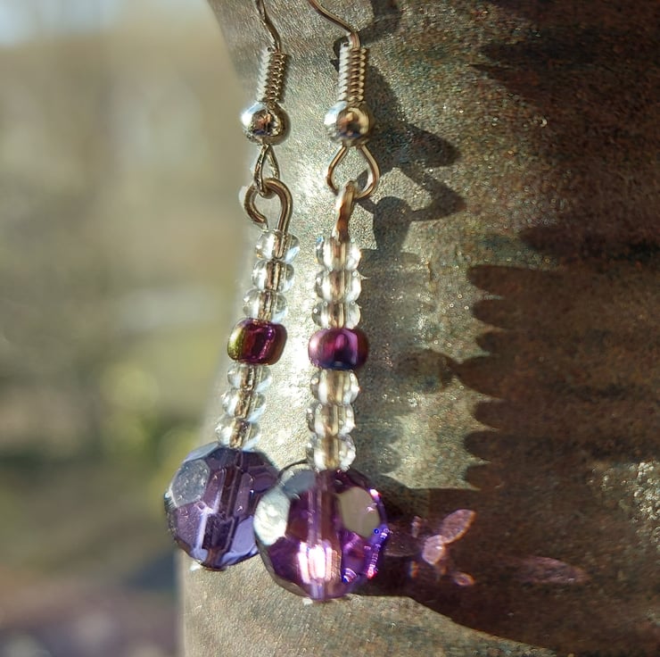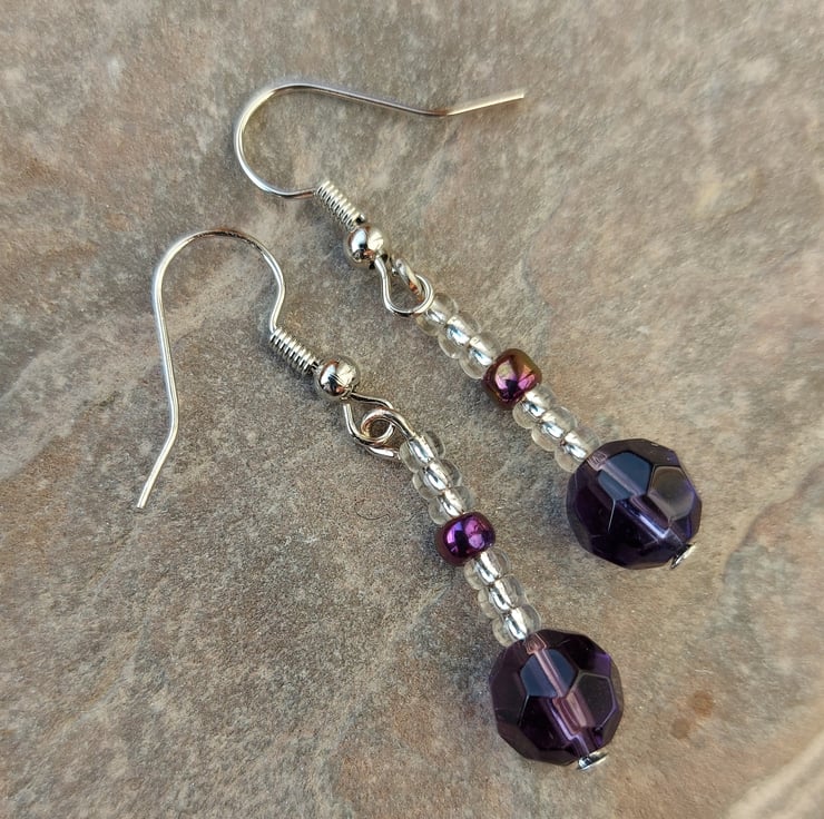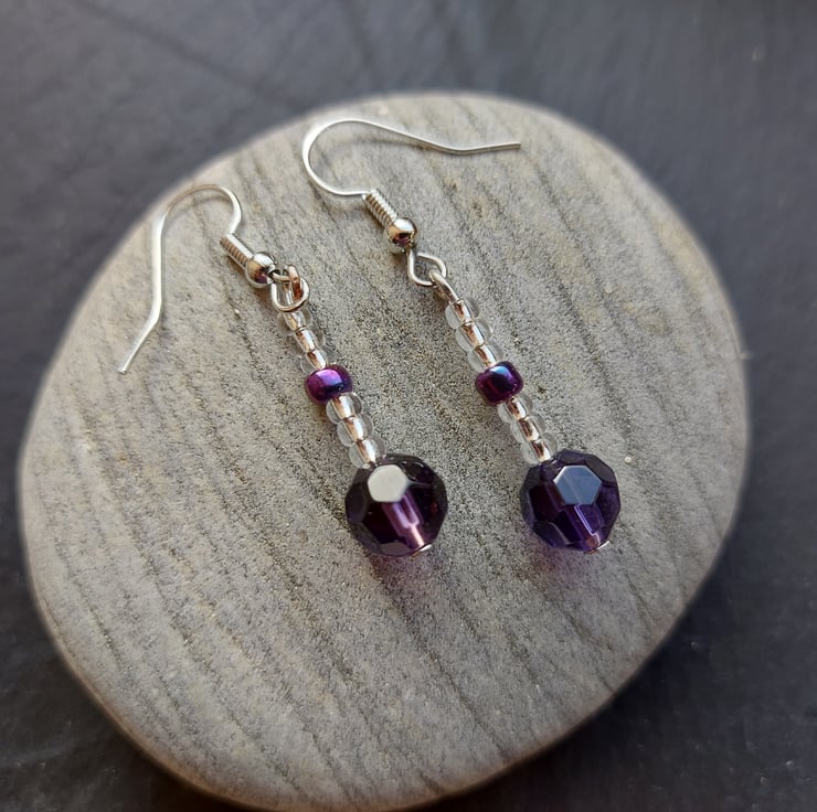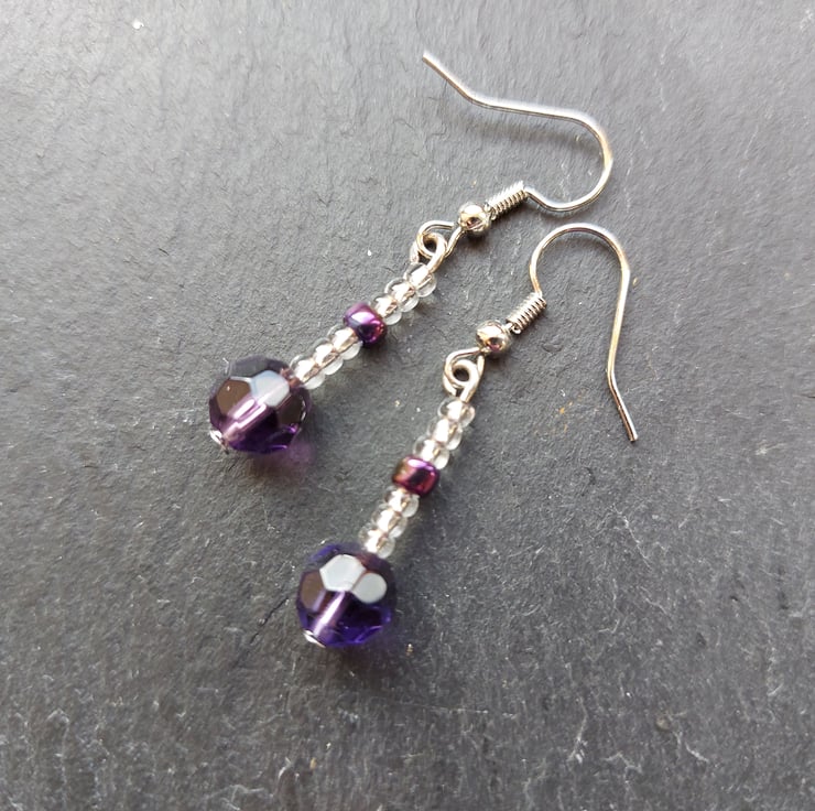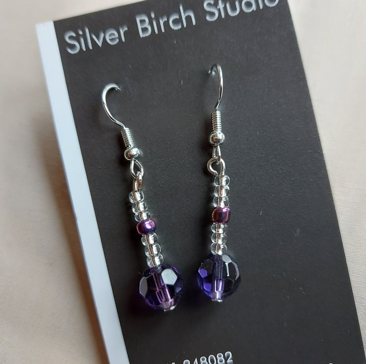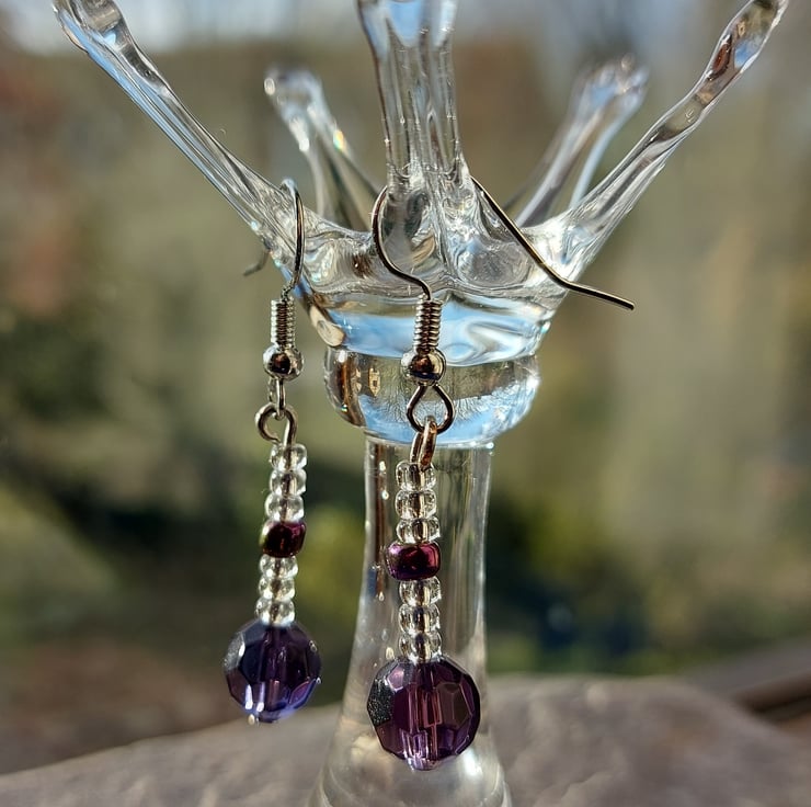 These sparkly dangle earrings have as their focal point an 8mm faceted round crystal bead in purple, complemented by six 3mm clear seed beads lined with silver and a 4mm purple bead. The earrings are light and comfortable to wear and the beads swing freely on their wire settings. The drop below the hook is 2.5cm. The ear and the bead wires are all made from silver-coloured jeweller's wire.