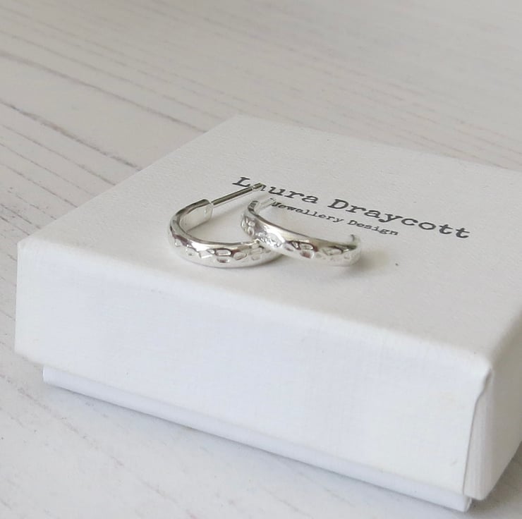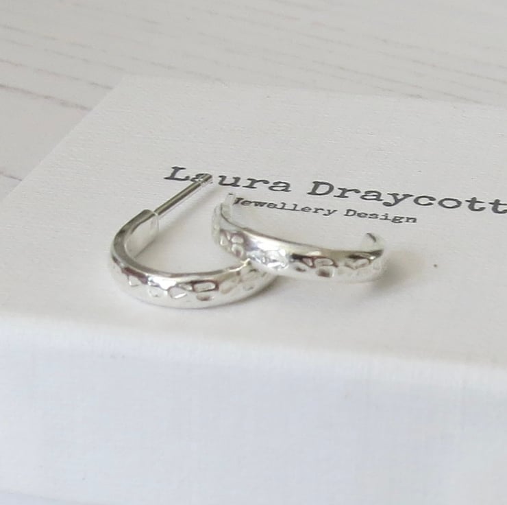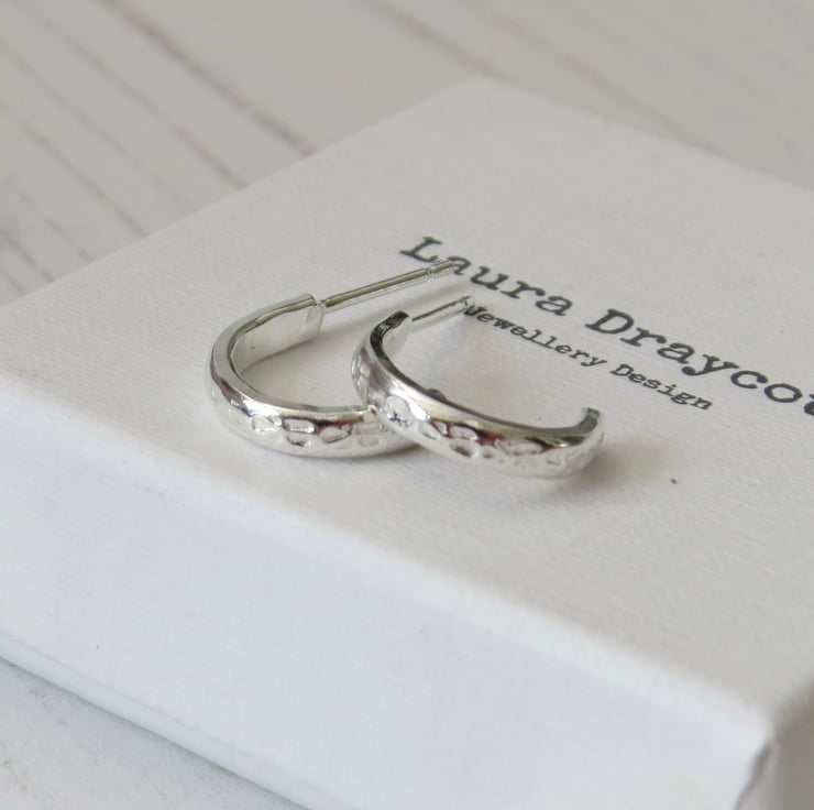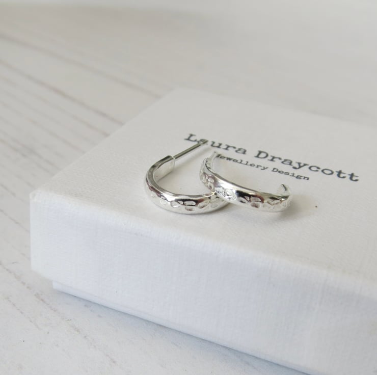 These pretty sterling silver half hoop earrings are hand made by cutting a length of D shape silver wire, which has a subtle flower design hand stamped onto it, and forming it into a half circle. A sterling silver ear post is then added and the earrings are polished to a high shine.
