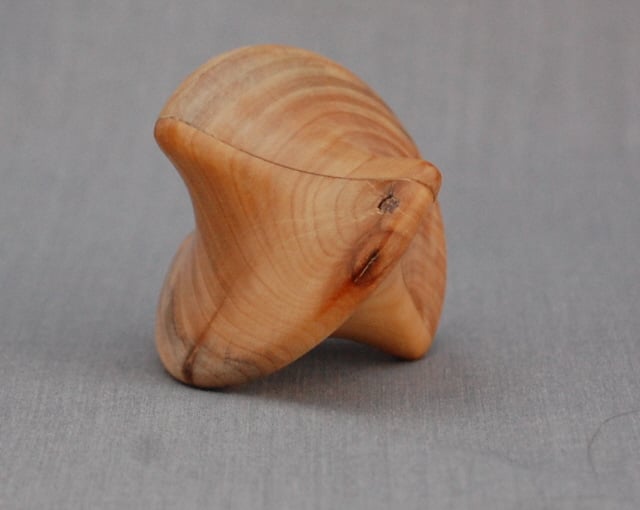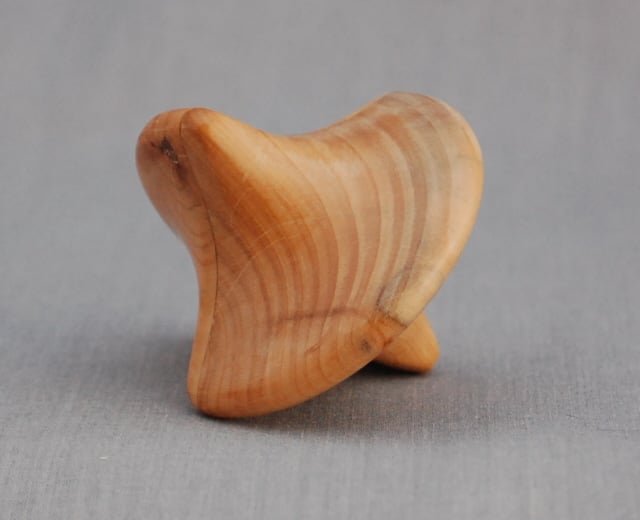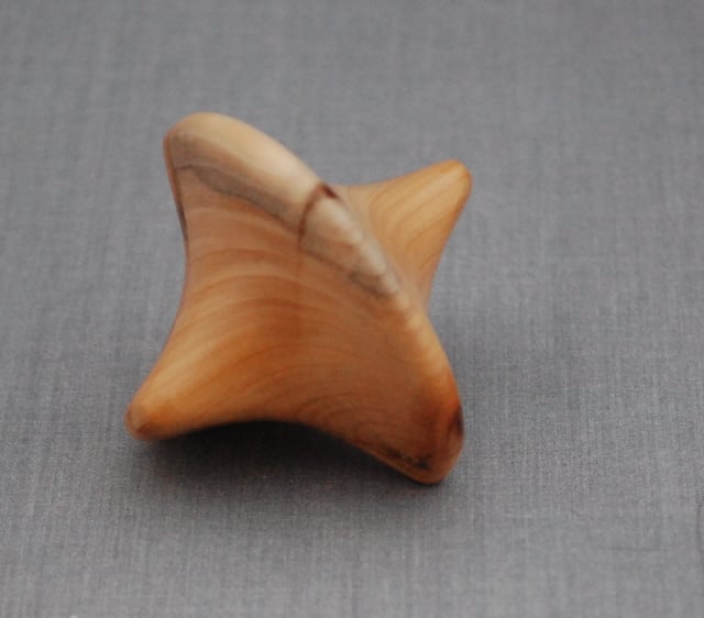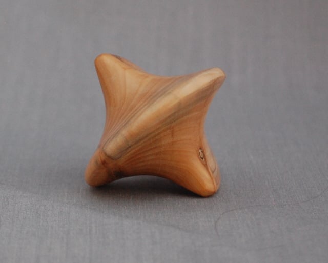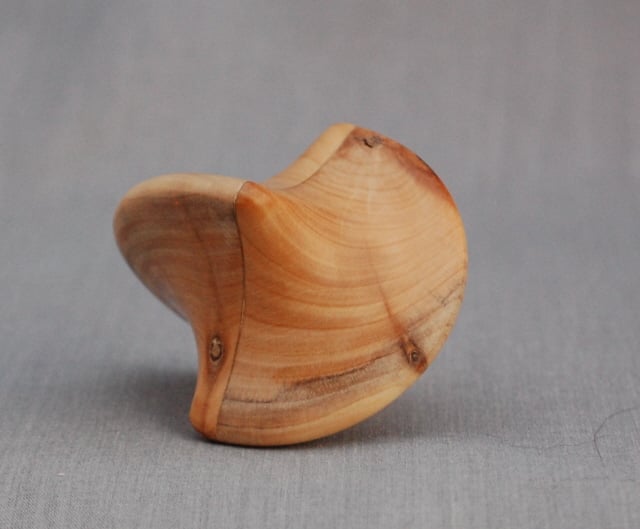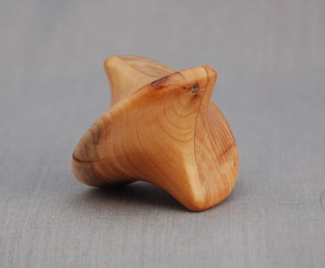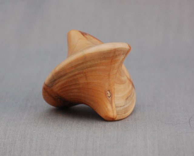 On a smooth surface, with a pat of a paw or mere fingertip push, it wobbles, wambles and rotates about for a considerable time and distance. As no two trajectories are the same, it is soothing and very quiet to play with. Measuring approximately 6 cm by 6 cm it is turned from home-grown yew.