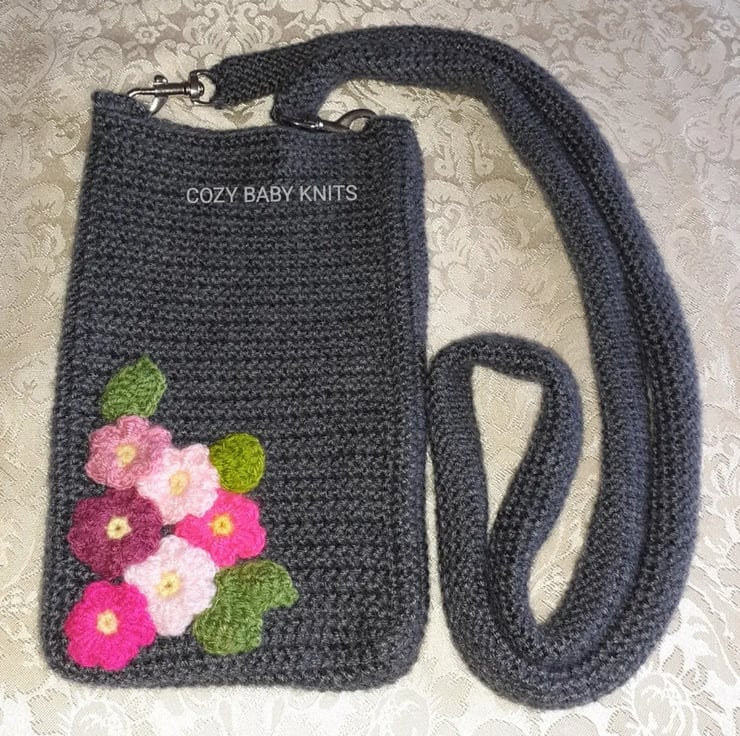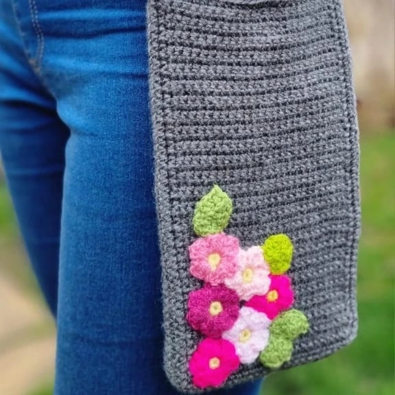 Appliquéd flowers on the front and plain back. It comes with a gusset so is wide enough for a phone and small wallet/keys.