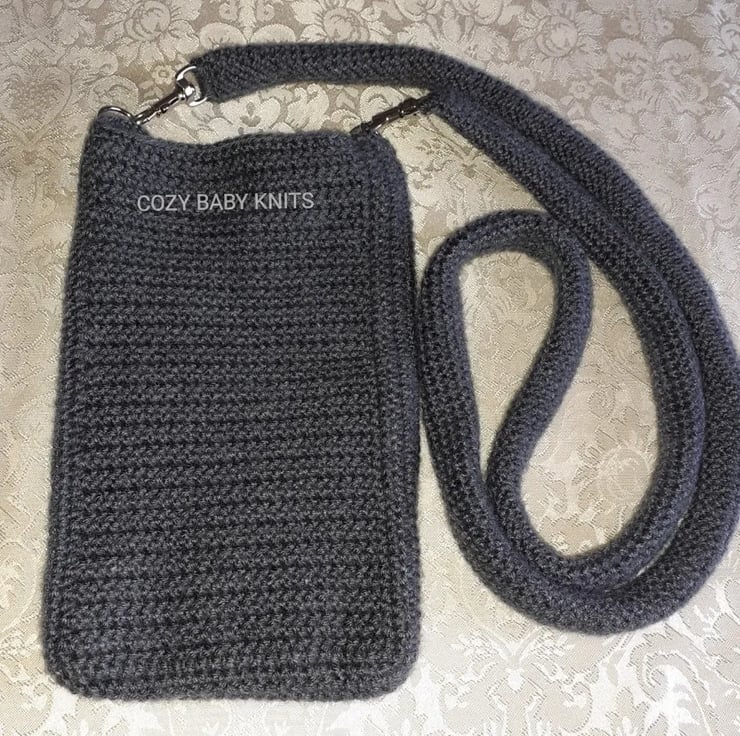 Crossbody phone bag with removable strap and magnetic snap clasp fastener.