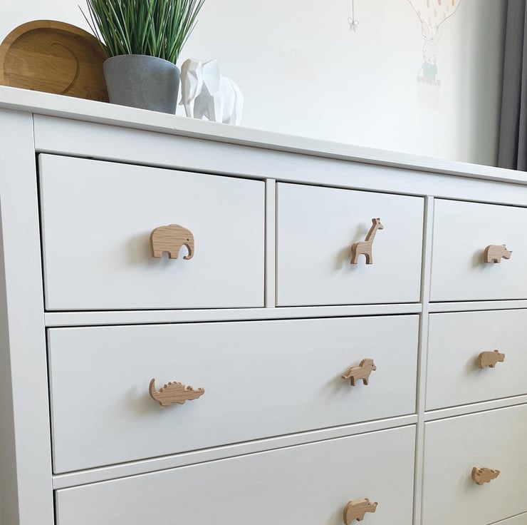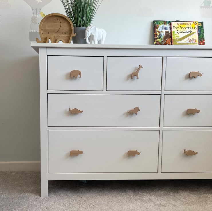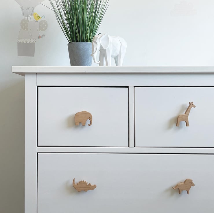 Spice up your safari nursery decor with these solid oak drawer pulls featuring six safari animals; a giraffe, elephant, hippo, rhino, crocodile and lion!