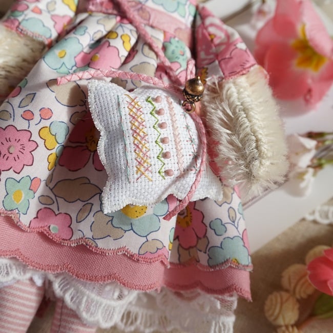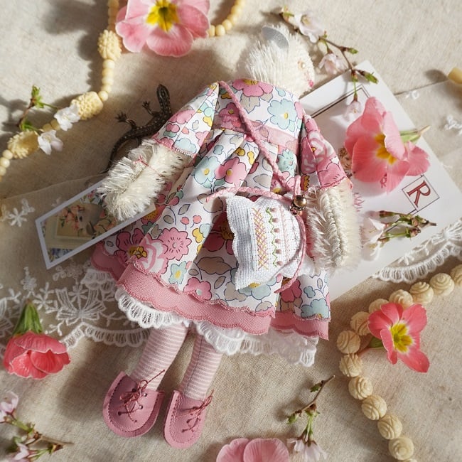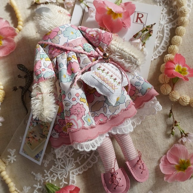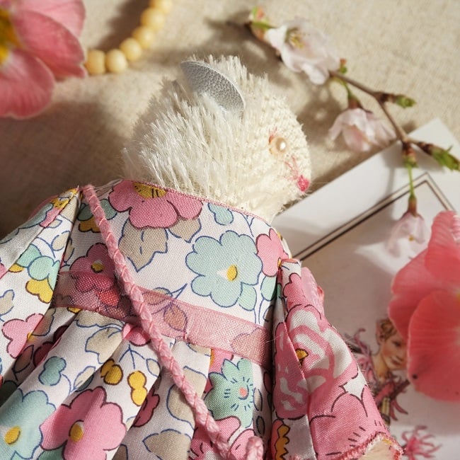 This is a Special Order for Tracy, a tiny mohair mouse. She is a hand embroidered mouse with little leather ears and tail. She is dressed in a Liberty tana lawn cotton called Betsy Rose, the pink version. Pretty blossom wanders around a soft white ground. She has coordinating underskirts in a warm pink essex linen, white tulle mesh and white cotton lace bloomers. Her dress is finished with organza ribbon, tiny buttons and little leather shoes. She is a white mohair mouse with white ears, a pink tail, pink whiskers and an embroidered pink nose.