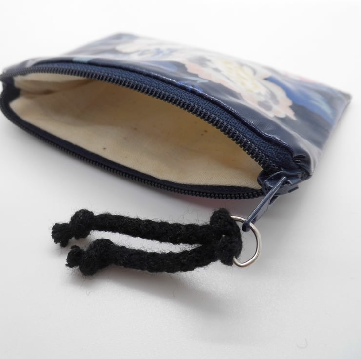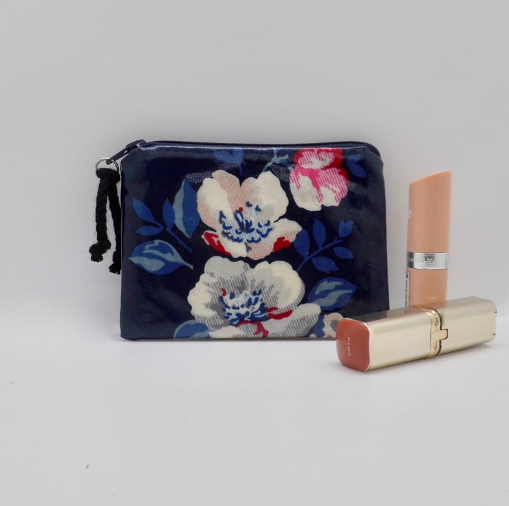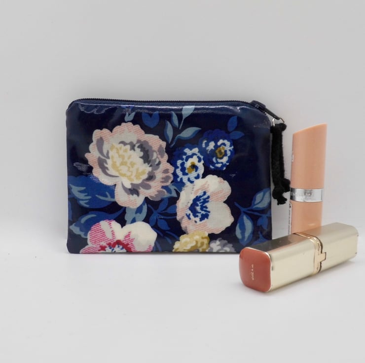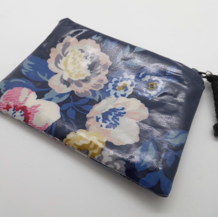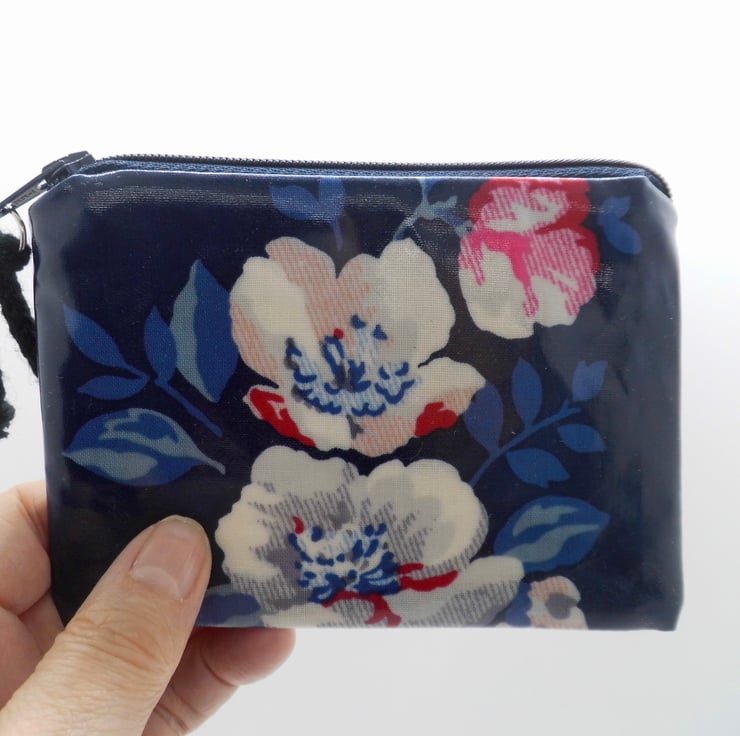 A useful coin purse, made with glossy oilcloth fabric in navy blue with large floral print. Lined with natural calico fabric, so there's no raw edges inside. Use it for cards or coins, as a mini make up bag, a purse for feminine products or other essential items.