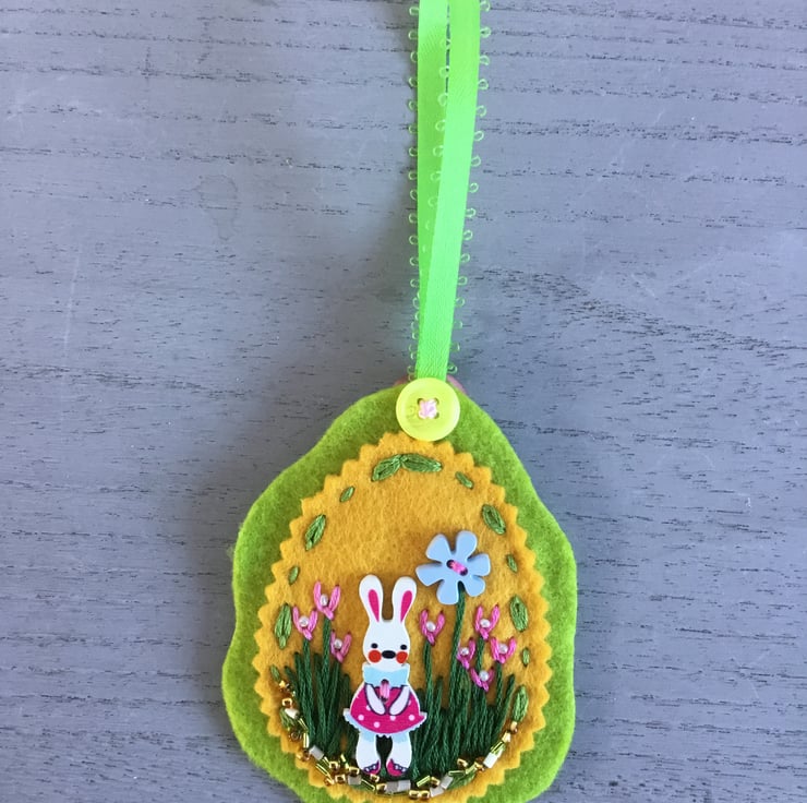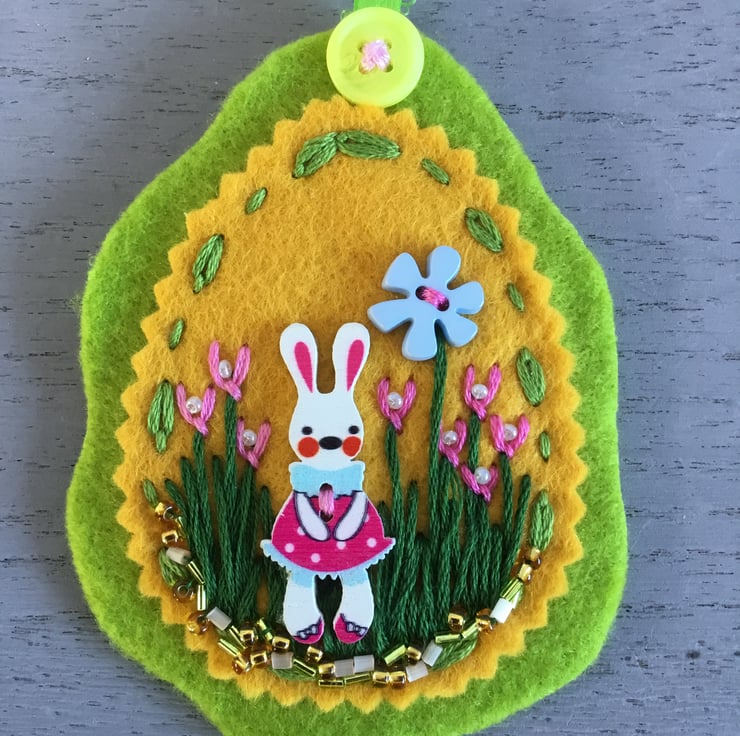 This Hand Embroidered Easter Decoration has an Easter scene hand embroidered on oval golden and green felt. A character girl Rabbit button is stitched in a field of flower, hand embroidered in Fly, Long and Lazy Daisy Stitches, she stands under a pale blue Flower button. Seed, bugle and glass beads embellish this border of flowers.