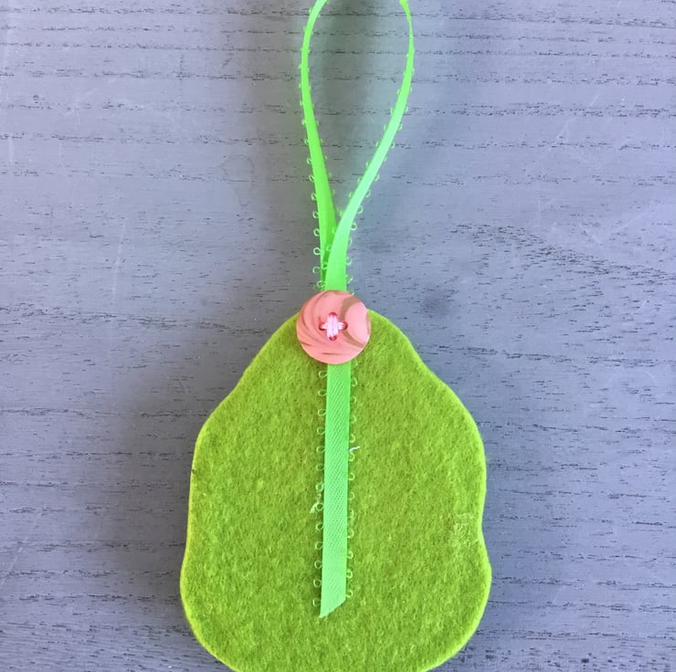 This hanging decoration is 4 by 3 inches (10 by 8 cms) with a long ribbon hanging loop at the top……to hang on a Spring or Easter branch, a door, cupboard handle, over a picture frame or on the wall.