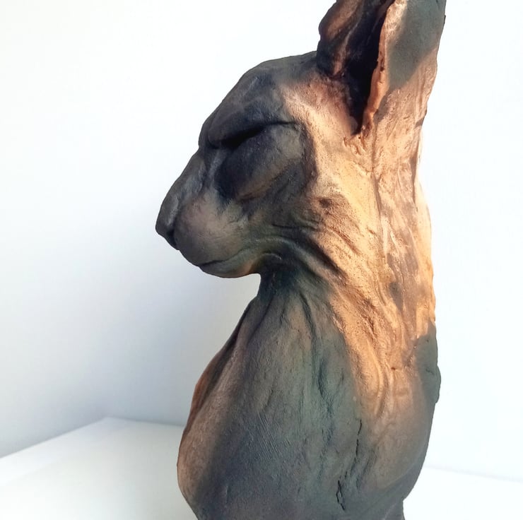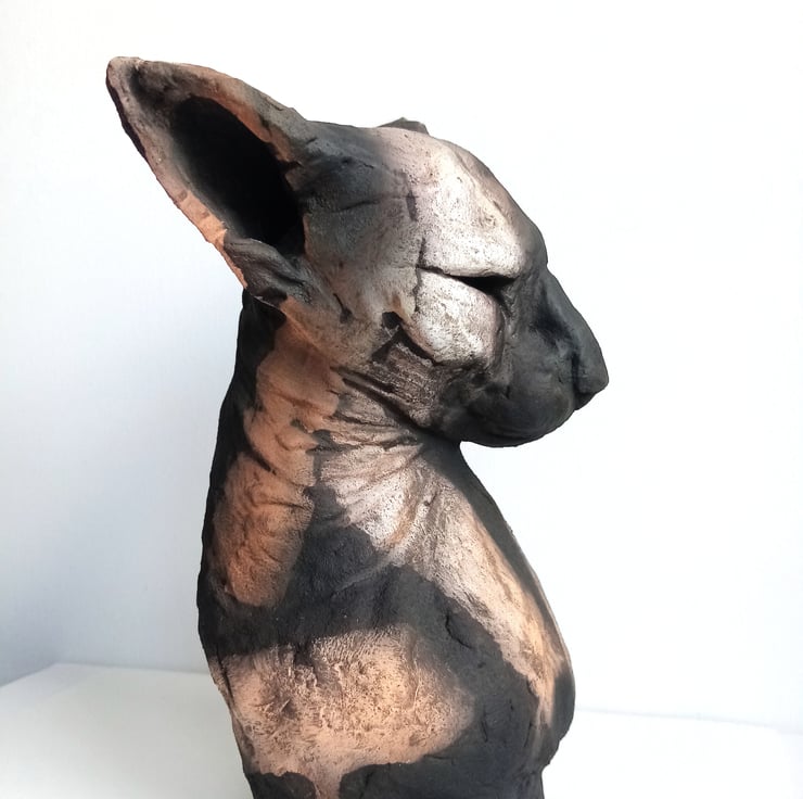 An original ceramic cat sculpture made from a white stoneware clay and finished with blended slips and pigments.