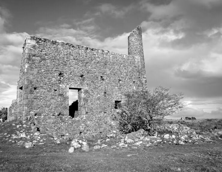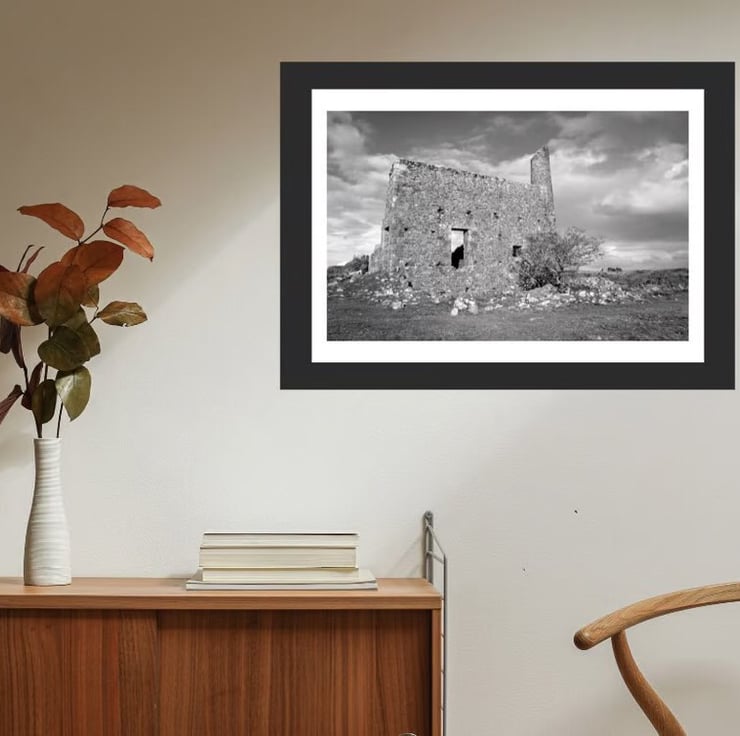 This black & white print is of an old mining Engine House ruin on the edge of Bodmin Moor in Cornwall, quite local to me and a nice subject for a photograph. In the distance you can see another similar structure which is now a visitor centre and the Hurlers - a series of standing stones probably dating back to the Bronze Age, both adding more interest to the image.
