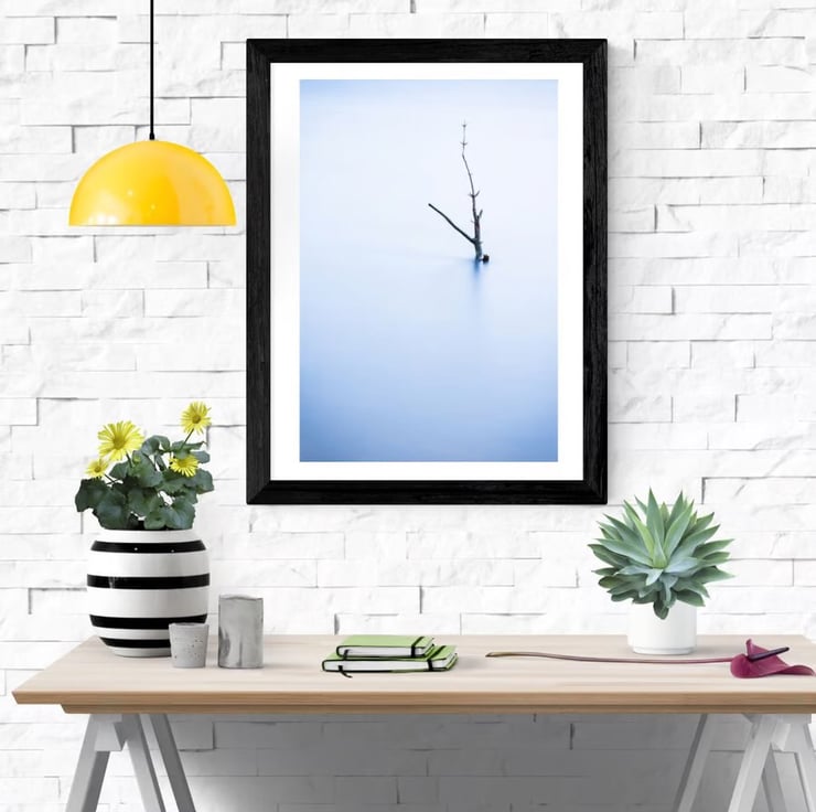 This wall art photography print is for all the minimalists out there. It was taken at a reservoir when the water levels were very high and this little tree had been almost completely submerged. A long shutter speed has smoothed out the ripples on the water and gives the impression of ice. Adding a cool blue tone gives a calm feeling to the shot. This minimalist type of image is a favourite of mine and I took several similar photos on this particular day as the conditions were just right.