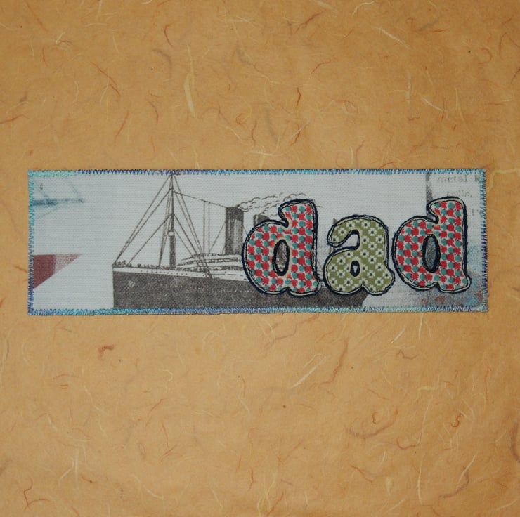 I'm sure that many Dads would love this vintage ocean liner themed bookmark. It measures 2.5 x 8 inches and is made from linen effect fabric featuring the steam boat with the word "Dad" appliqued on. The edge is stitched in variegated thread and it has a plain blue fabric on the reverse and a layer of stiffening for a quality feel.