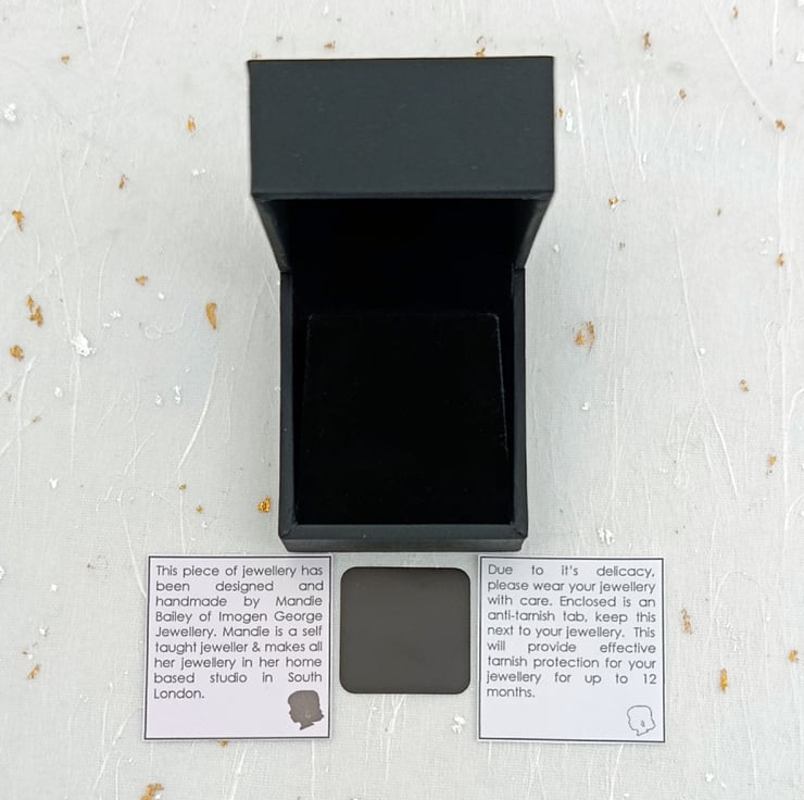 The earrings will arrive in a black box, complete with simple care instructions and a small anti tarnish tab.