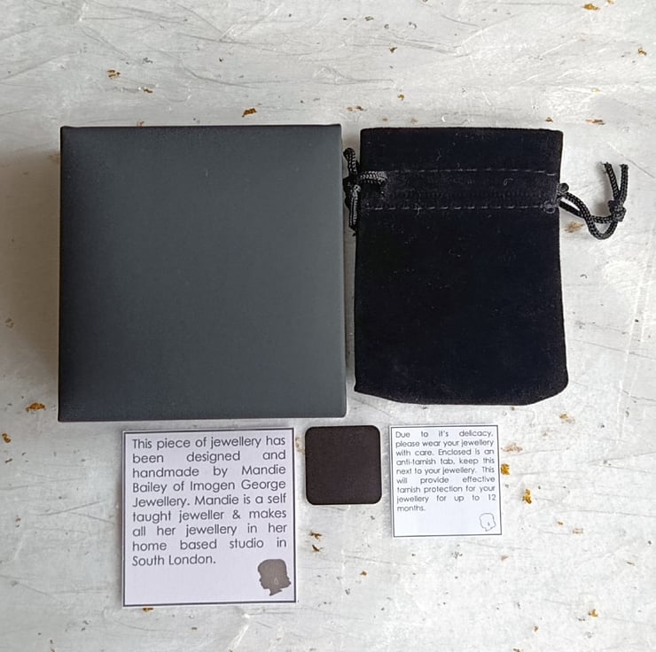 The earrings will arrive in a velvet bag, inside a black jewellery box, complete with simple care instructions and a small anti-tarnish tab.
