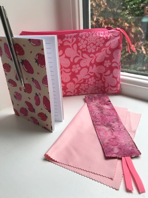 Reader's Padded Glasses Pouch (glasses not included) containing bookmark, glasses cloth, notebook, pen. Approx size 8" x 5".