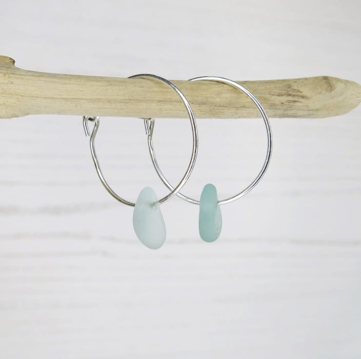 Sea foam Cornish sea glass on a simple pair of dainty sterling silver 18mm hoop earrings.