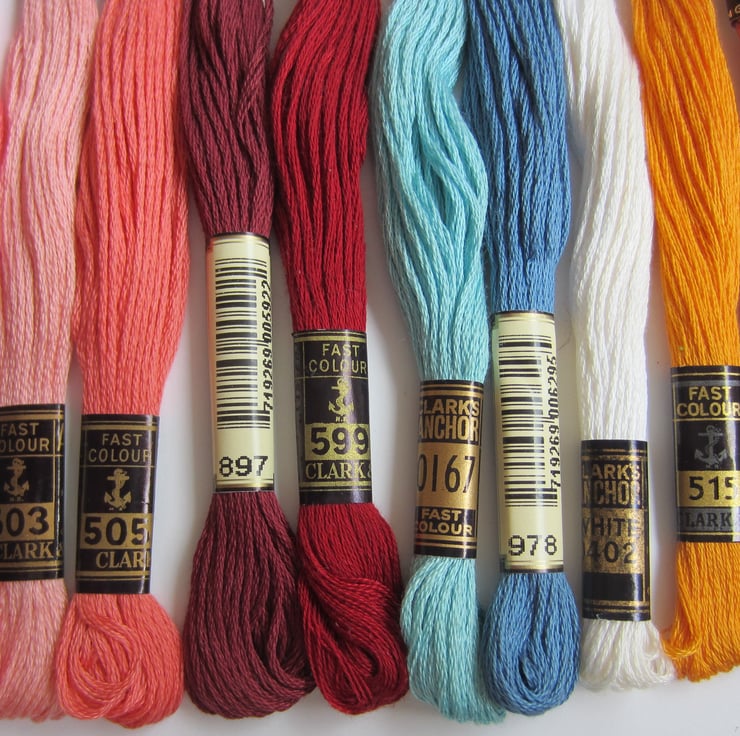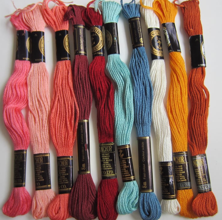 Selection of 10 skeins of Anchor embroidery threads in assorted colours