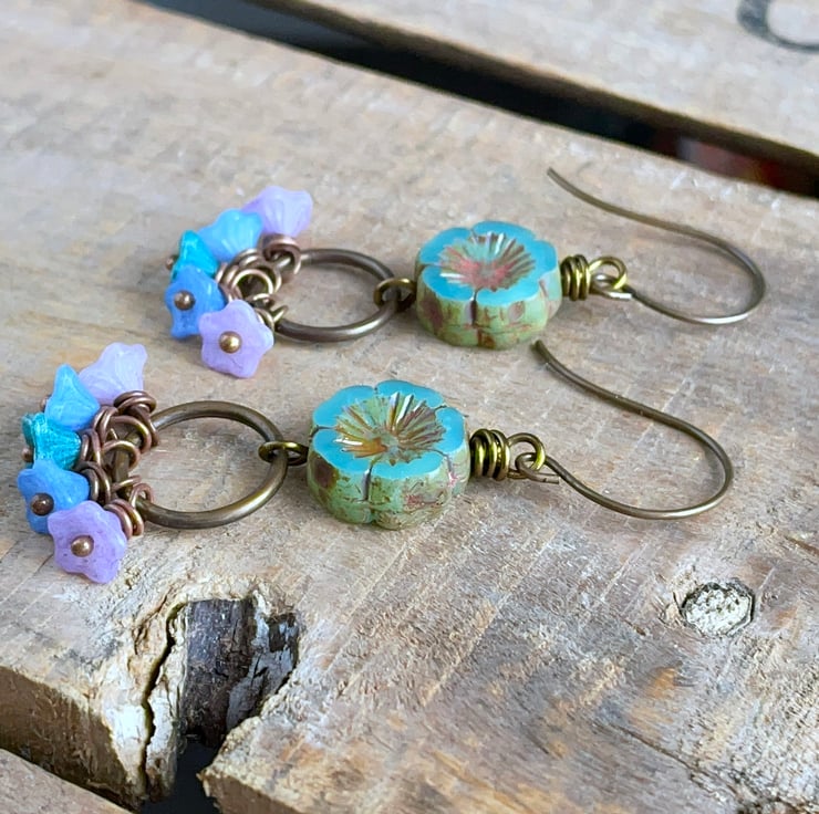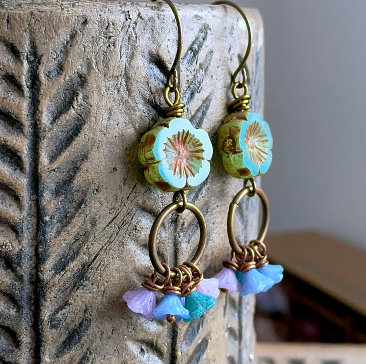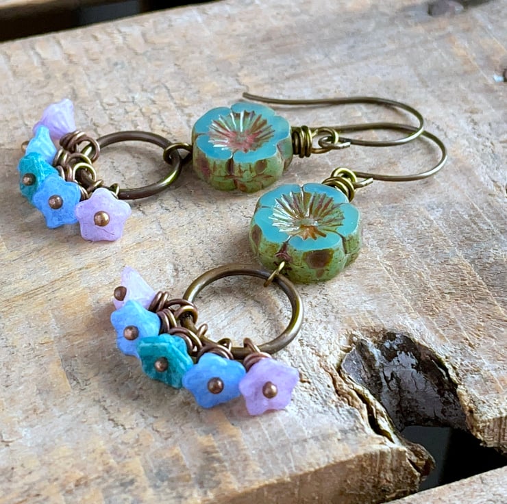 Below, I have added a cluster of wire wrapped Czech glass bell flowers in frosted shades of green, blue and lilac. These tiny flowers have been wire wrapped onto copper ball headpins, and simply dangle from a Vintaj brass ring.