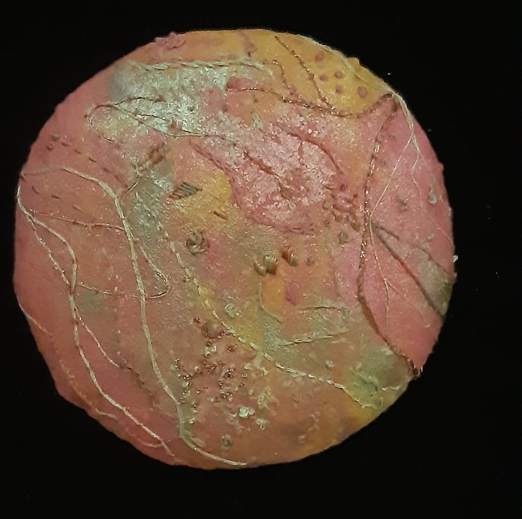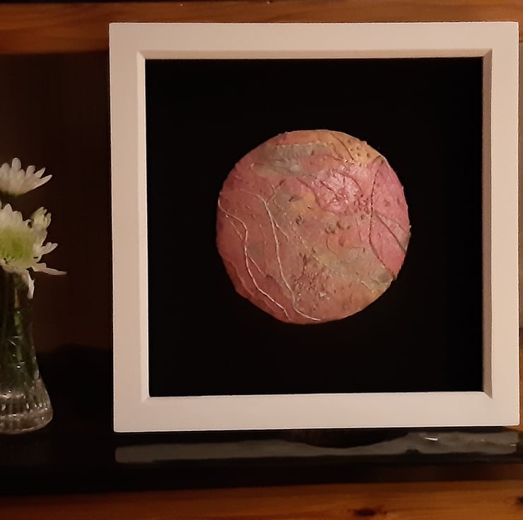 Imaginary Pink Planet on fabric painted with pearlised acrylics, overlaid with hand embroidery, raised and mounted on black silk and presented in a deep frame. External 24cm x 24cm. Internal 20cm x 20cm. A one off.