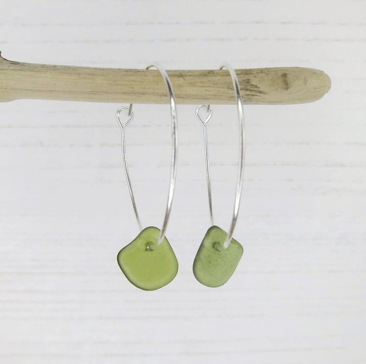 Olive green Cornish sea glass on a larger simple pair of dainty sterling silver 30mm hoop earrings.