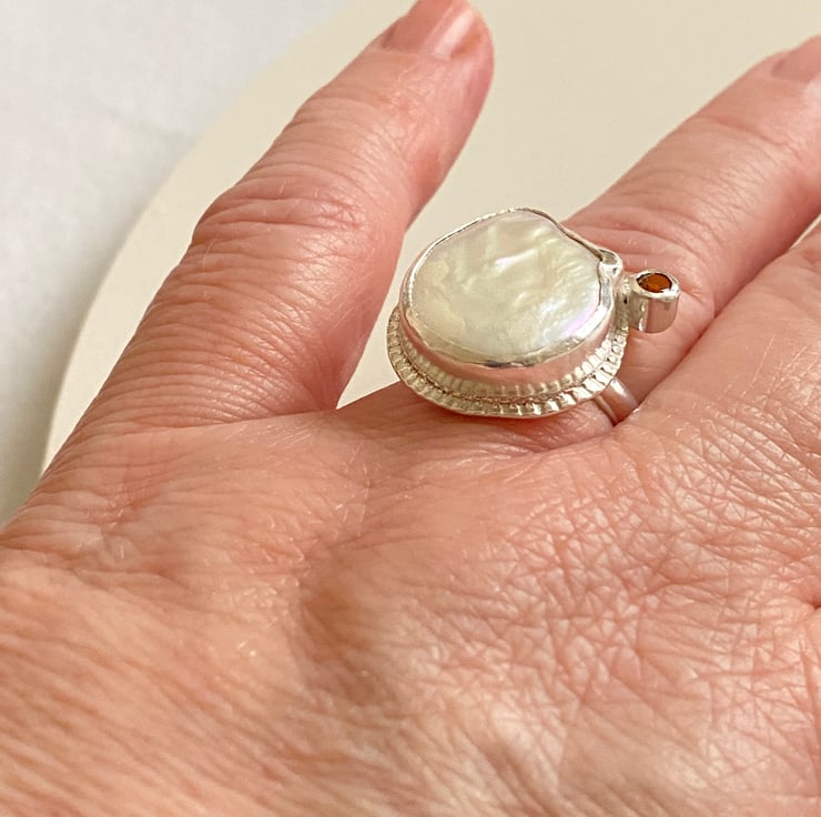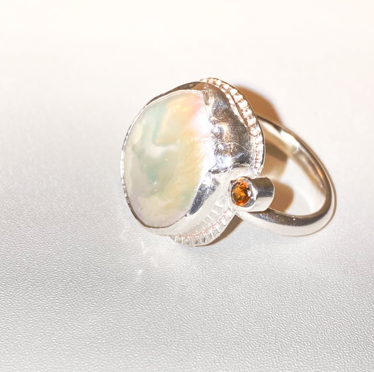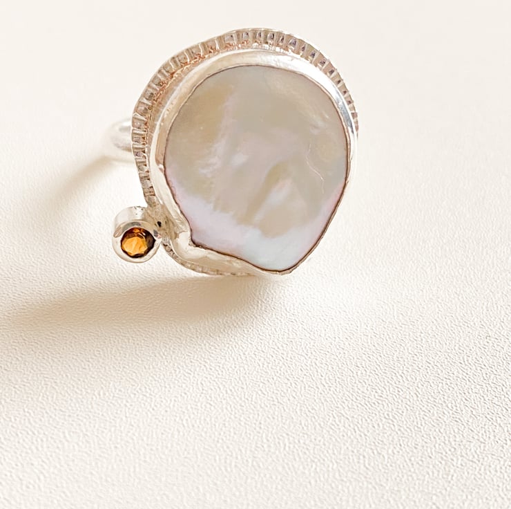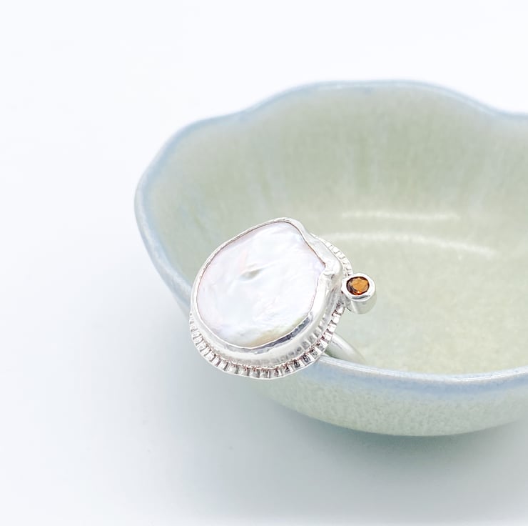 White freshwater cultured Keshi pearl has been set into silver along side a golden Tourmaline