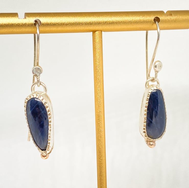 Two deep blue Sapphire cabochons have been set in sterling silver and decorated with solid 9ct gold. Around the Sapphire has been hand textured making a pair of unique earrings. Handmade in my home studio in the UK using traditional metal smithing techniques.