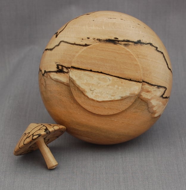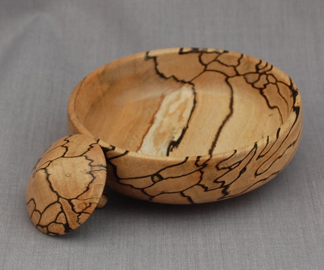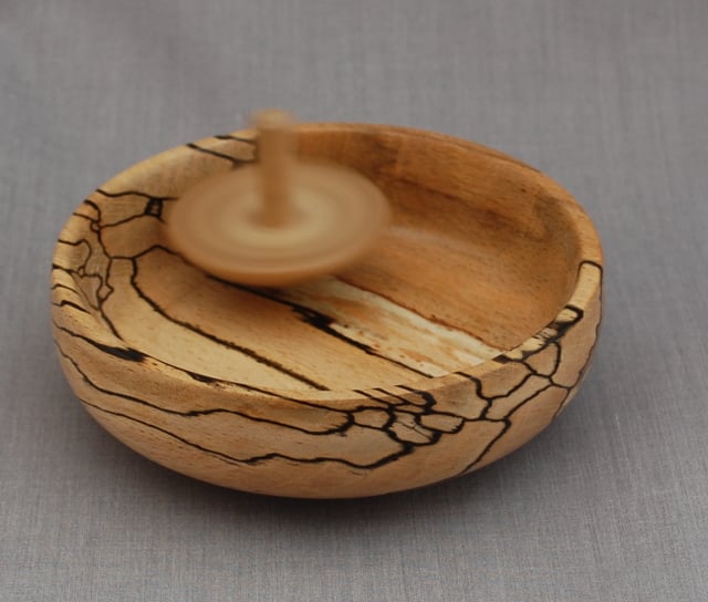 Our top and dish gift for adults is a great stress busting object. Discreet enough to take a place on a desk, it can help relax the mind while flexing those tired fingers. Spin the top, listen to the whir, and wait for the moment the top wobbles to a halt-then start again. Handsome enough for a coffee table and irresistible when in reach and pleasing to look at, this smooth top and dish deserves a place in your home. Randal has made this dish from uniquely marked spalted beech. It measures approximately10 cm in diameter and 3 cm high, the top 4 cm high and 4 cm wide.