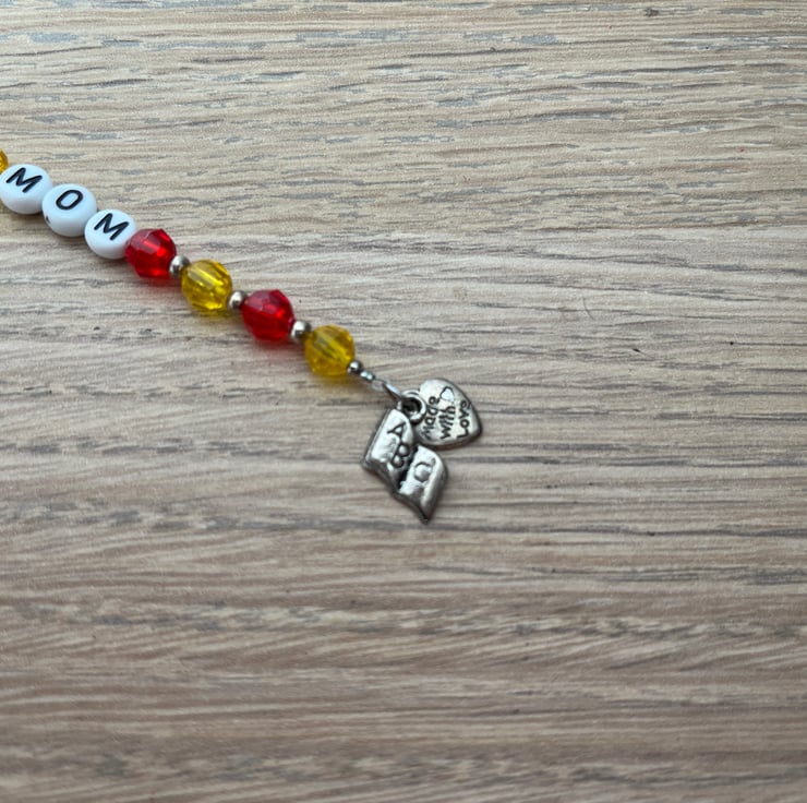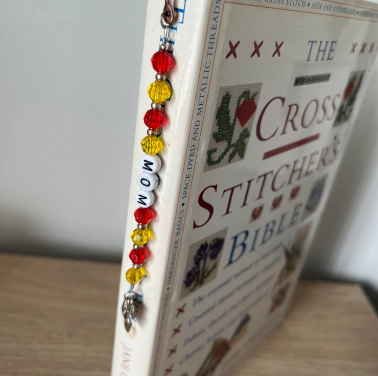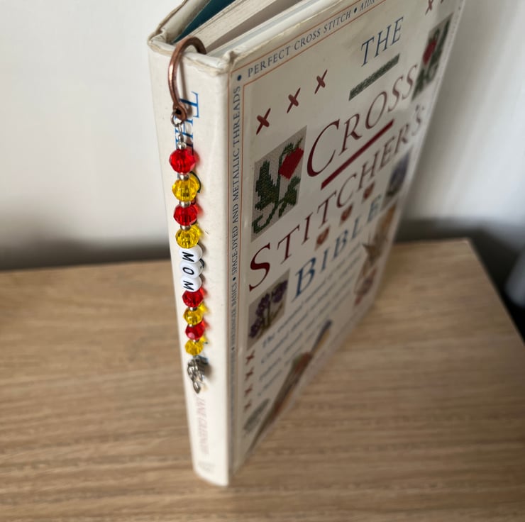 Made using red and yellow beads either side of letter beads spelling out ‘mom’, attached to a copper coloured bookmark hook which sits over the spine of a book as shown in the pictures