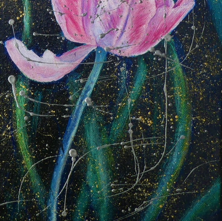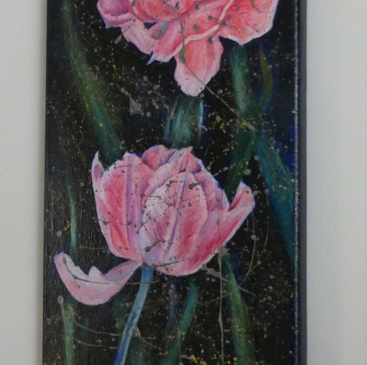 A botanical canvas of two coral pink multipetaled tulips set against a worked black background.