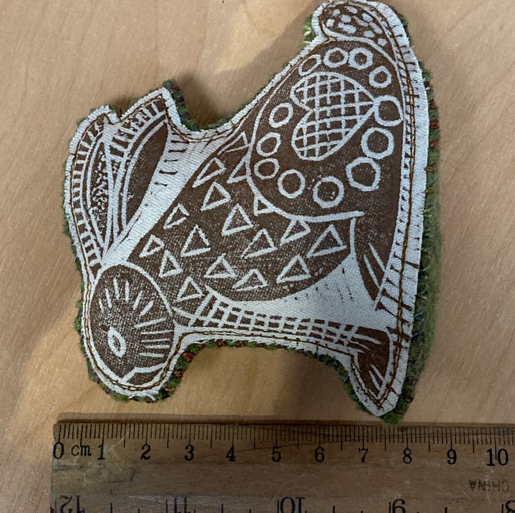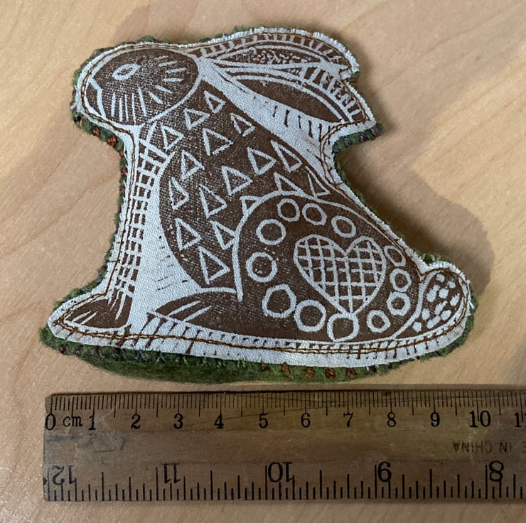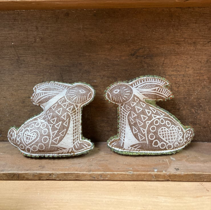 Printed on vintage cotton , and then stitched onto wool felt so they stand up on their own - clever hares.